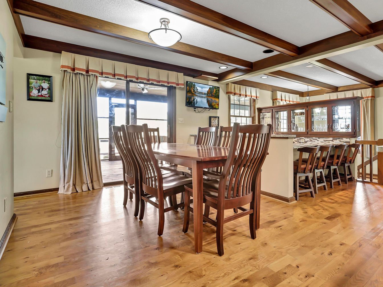 A spacious dining area features a large wooden dining table surrounded by eight matching chairs with high, slatted backs. The room has warm honey-toned hardwood floors, cream-colored walls, and wooden ceiling beams that add architectural interest. Along the left is a sliding glass door with beige drapes and a decorative valance accented with a red stripe, leading to an outdoor space. A television is mounted above a window, and family photographs hang nearby. Beyond the dining area, a breakfast bar with several bar stools and a mirrored hutch displaying glassware creates an inviting, traditional atmosphere.