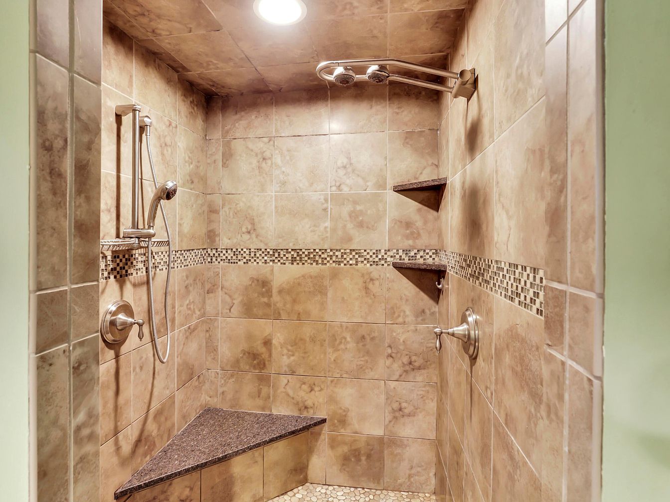 Spacious walk-in shower featuring large tan tiles with a marbled effect, arranged neatly on the walls and ceiling. A horizontal band of small, mosaic tiles in earth tones provides a decorative accent running around the middle of the walls. The design includes two corner shelves made of dark stone for storage, and a matching triangular corner bench for seating. There are two chrome showerheads, one fixed and one handheld, adding a sense of luxury. The lighting is soft and recessed, enhancing the warm, inviting atmosphere of the space, which is both functional and stylish.