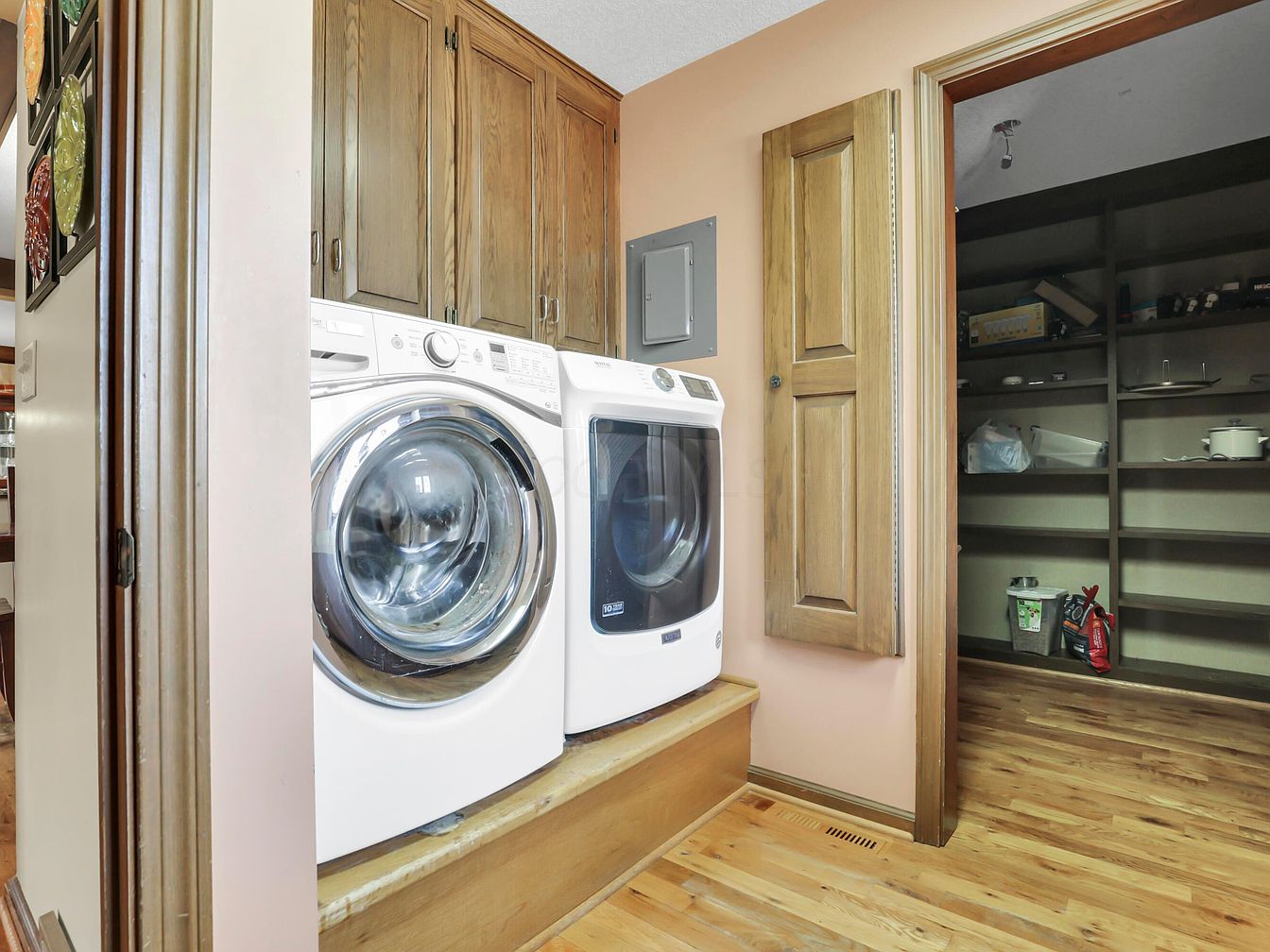 This laundry area features a front-loading washer and dryer set on a wooden platform, positioned against a soft peach-colored wall. Overhead, there are multiple wooden cabinets with a rich medium-brown finish for extra storage. To the right, a doorway opens into a spacious pantry or utility closet with built-in deep shelves, partially filled with household items. The flooring is light-toned hardwood, adding warmth to the space, while an accent wall displays colorful decorative plates. The overall look is clean, practical, and organized, with a cozy, traditional American home feel and an emphasis on utility and accessible storage.