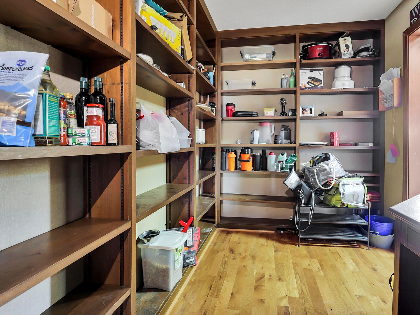 Spacious walk-in pantry with wood shelving units lining two adjacent walls, filled with a variety of food items, small kitchen appliances, and storage containers. The floor is a natural light-stained hardwood, giving the space a warm and inviting yet utilitarian feel. Shelves contain jars, bottles, canned food, and plastic bins, while the right side also holds kitchen gadgets and cups. Overhead lighting keeps the pantry well-lit. The overall layout is open and organized, allowing easy access to supplies and maintaining a neat, functional ambiance with rustic wooden tones and visible modern kitchen essentials.