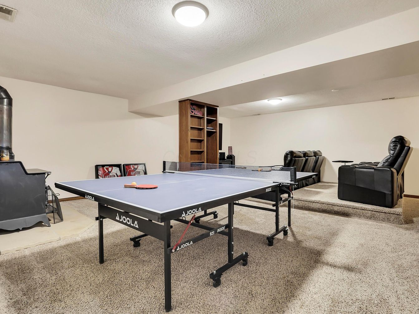 A spacious basement features a cozy recreation zone with a dark blue ping pong table as the central focus, complete with paddles and net ready for play. To the left stands a freestanding wood-burning stove adding warmth and character, set on a light stone platform. In the background, plush black leather recliners form a small home theater section with a raised carpeted platform, perfect for movie nights. The walls are painted a soft cream, contrasted by natural wooden trim and built-in shelving along one side, providing both storage and a hint of rustic charm. Soft beige carpeting covers the floor, enhancing comfort.