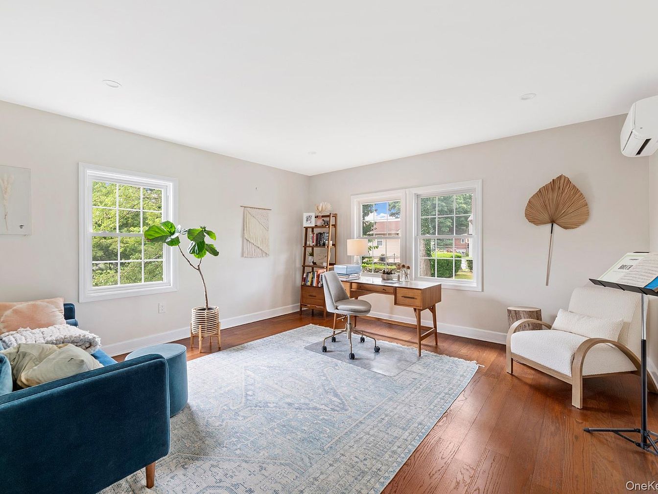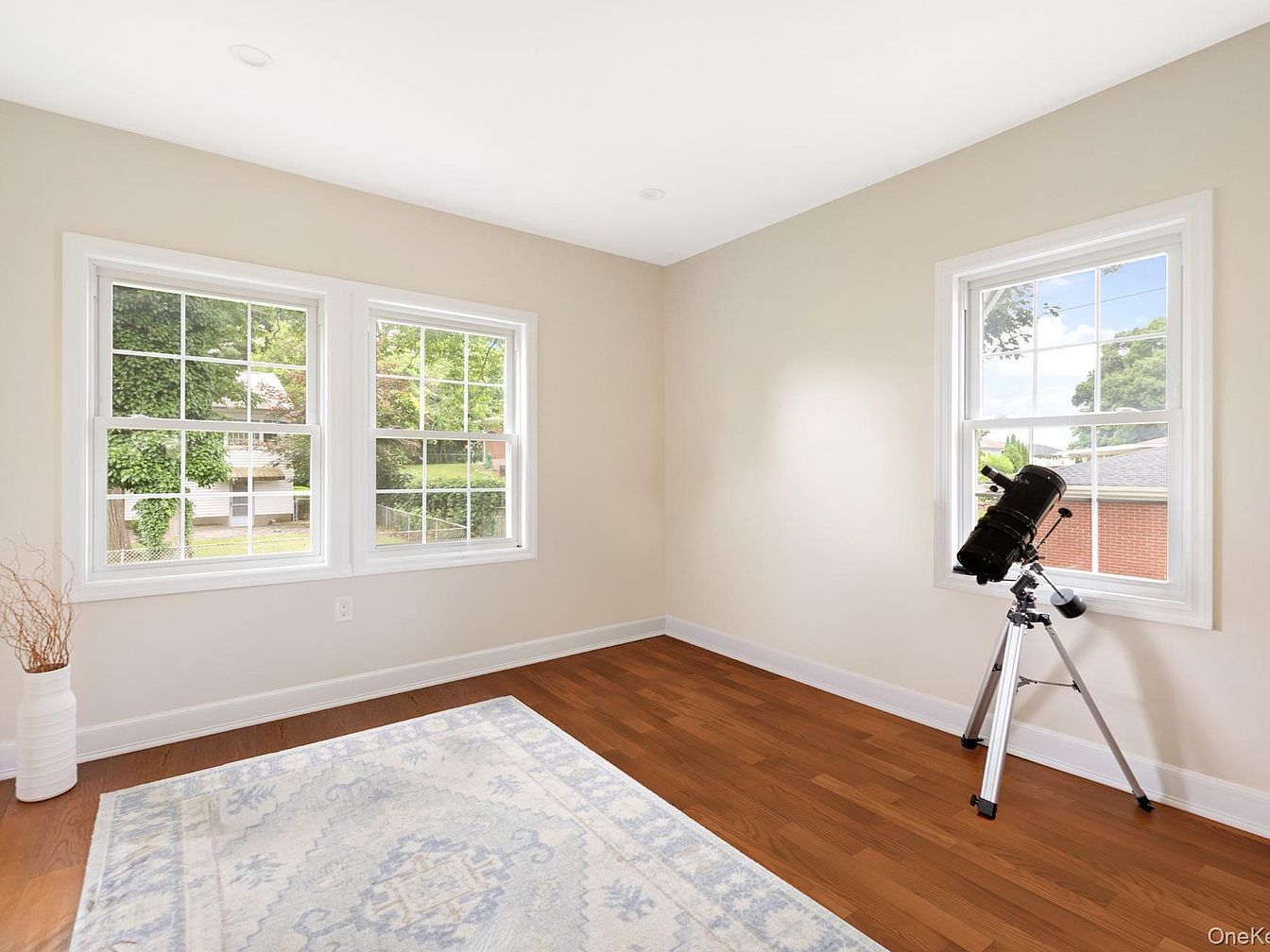 This spacious attic features a sloped ceiling that adds character and openness. The walls are painted in a soft cream color, enhancing light reflection. Natural light floods the area through two well-placed double-hung windows, framing views of greenery. The warm, honey-toned hardwood floor complements the wall color and adds a cozy touch. A modern white door with a sleek design introduces an element of contrast. Recessed lighting installed in the ceiling provides ample illumination, creating a bright and inviting environment perfect for a versatile use, such as a home office, playroom, or additional storage.