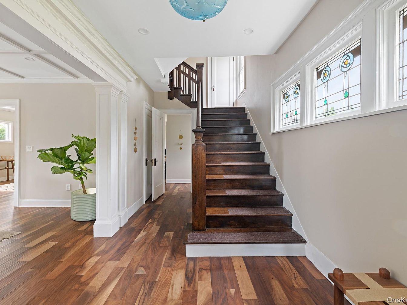 The entryway features rich hardwood flooring with warm, varied tones, creating an inviting atmosphere. A grand staircase, crafted from dark wood, ascends elegantly, flanked by intricately designed stained glass windows that introduce colorful light. The walls are painted a soft beige, enhancing the space’s brightness. Ceiling details include decorative molding, adding a classic touch. A potted plant in a textured pale green planter brings a pop of greenery and liveliness. Minimalist decor and a small wooden bench provide functional elements without cluttering the serene, open design, embodying a blend of traditional charm and modern simplicity.