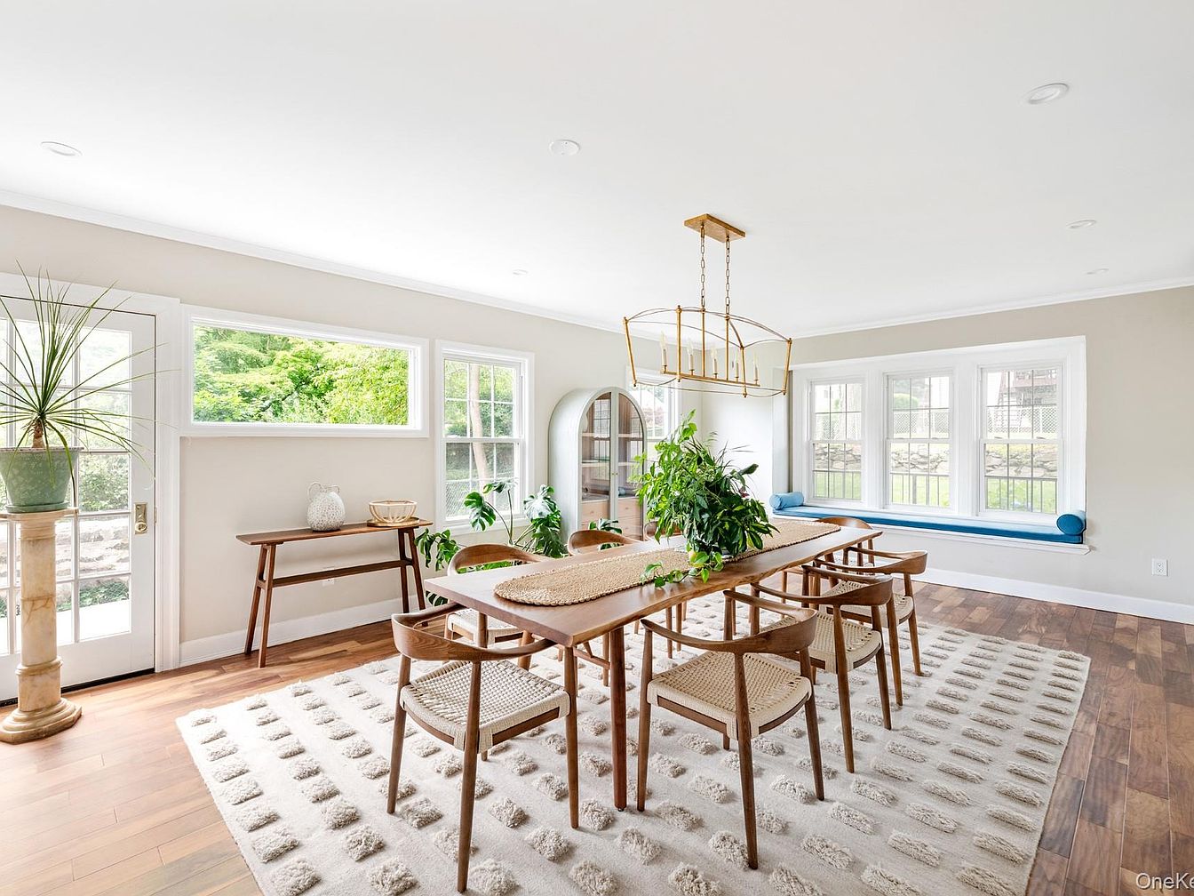 This inviting dining room showcases a harmonious layout with a central wooden table surrounded by stylish, mid-century chairs, featuring woven seats. The soft beige walls complement the rich, warm tones of the hardwood floor. Natural light floods in through expansive windows, highlighting the lush greenery outside. A statement chandelier hangs overhead, adding a modern touch. In one corner, a tall potted plant adds a vibrant pop of greenery, while a simple side table displays decorative items. An elegant window seat with blue cushions invites relaxation, enhancing the room’s cozy, welcoming ambiance.