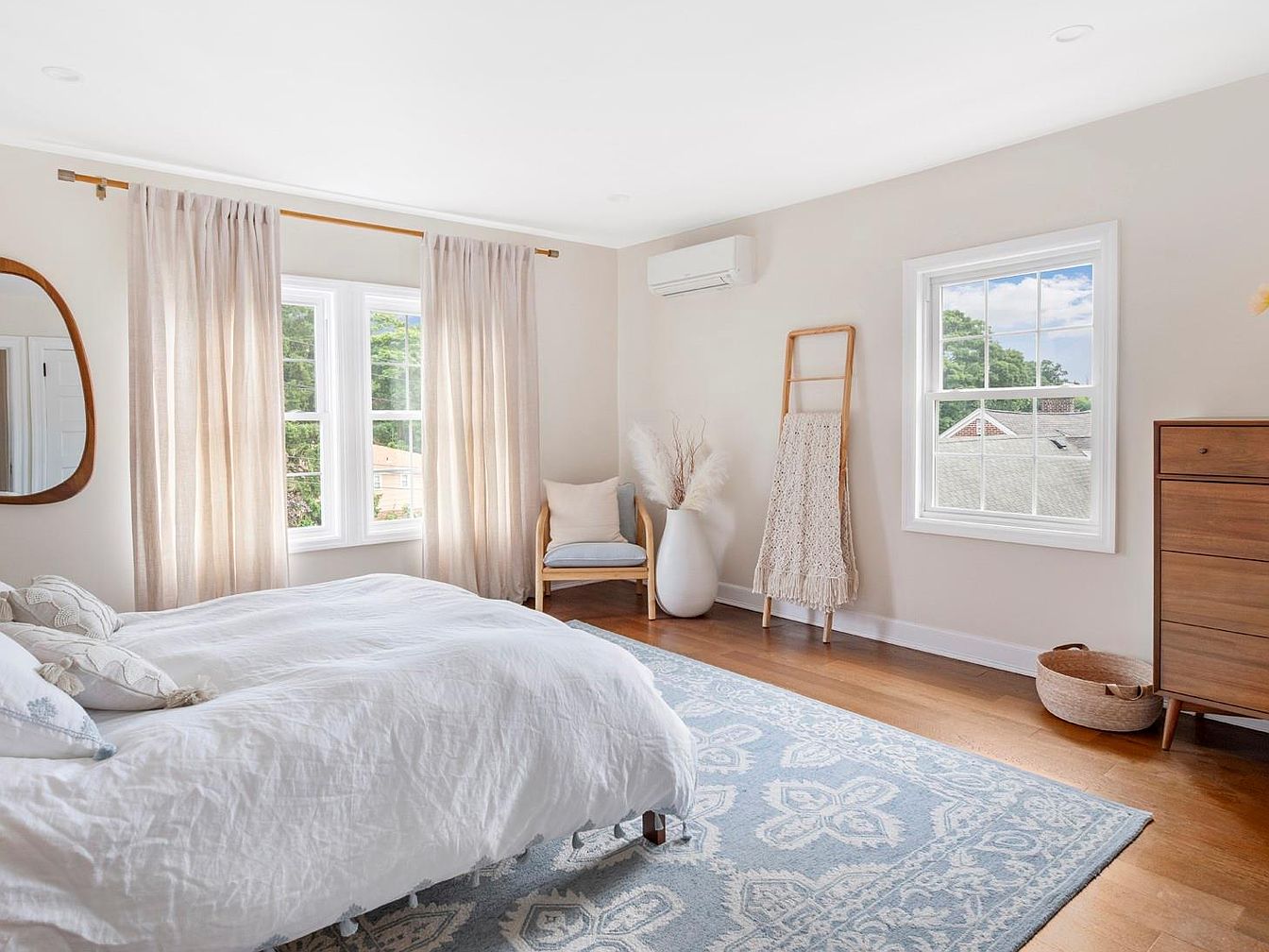 This spacious bedroom radiates simplicity and tranquility. The walls are a soft beige, complementing the warm, polished hardwood floor that adds a natural element. Large windows on two walls flood the room with natural light, offering scenic views of the surroundings. A subtle blue-patterned area rug anchors the seating area, which features a modern white daybed adorned with plush cushions for comfort. An understated wooden headboard adds warmth against the otherwise neutral decor. The ceiling is crisp and white, contributing to the airy atmosphere, while an integrated air conditioning unit ensures year-round comfort.
