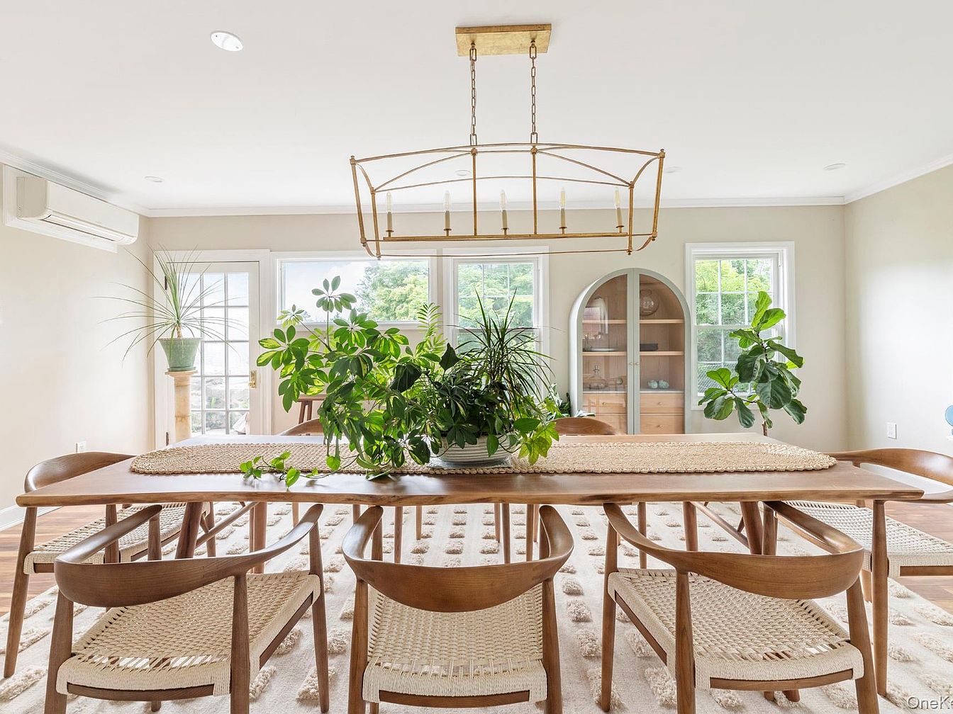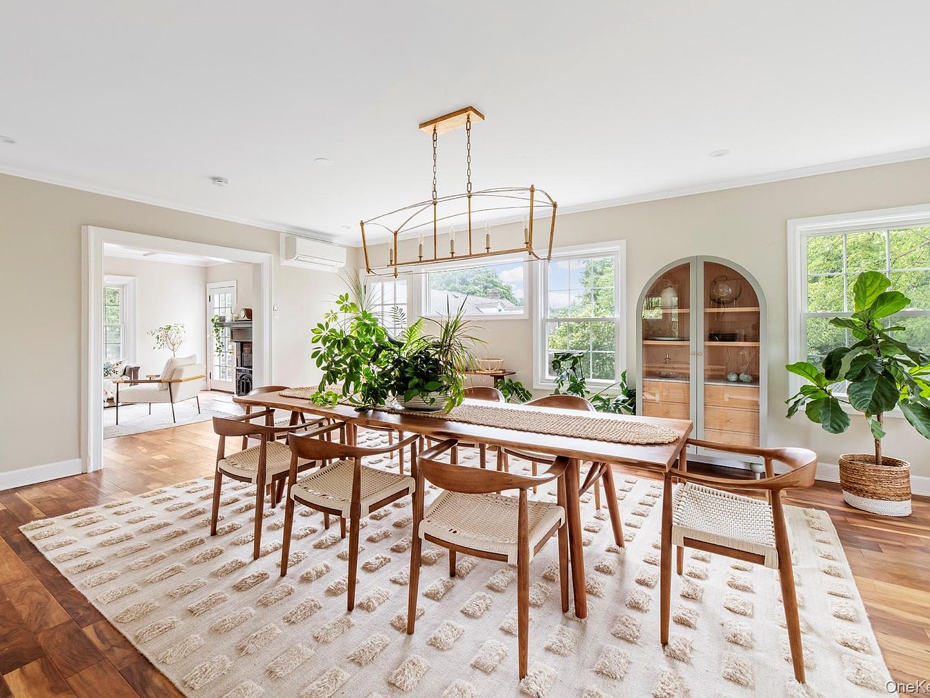 This dining area features a long wooden table flanked by stylish chairs with woven seats, creating a modern yet warm ambiance. The room boasts a light, neutral color palette with soft beige walls and rich hardwood flooring that adds character. A striking gold chandelier hangs above the table, offering elegant illumination. An ornate gold-framed mirror reflects natural light, enhancing the spacious feel. Potted plants add a touch of greenery, contributing to the room’s lively atmosphere. A cozy rug with a textured pattern provides warmth underfoot, while an open doorway leads to a well-lit adjoining space, fostering connectivity.