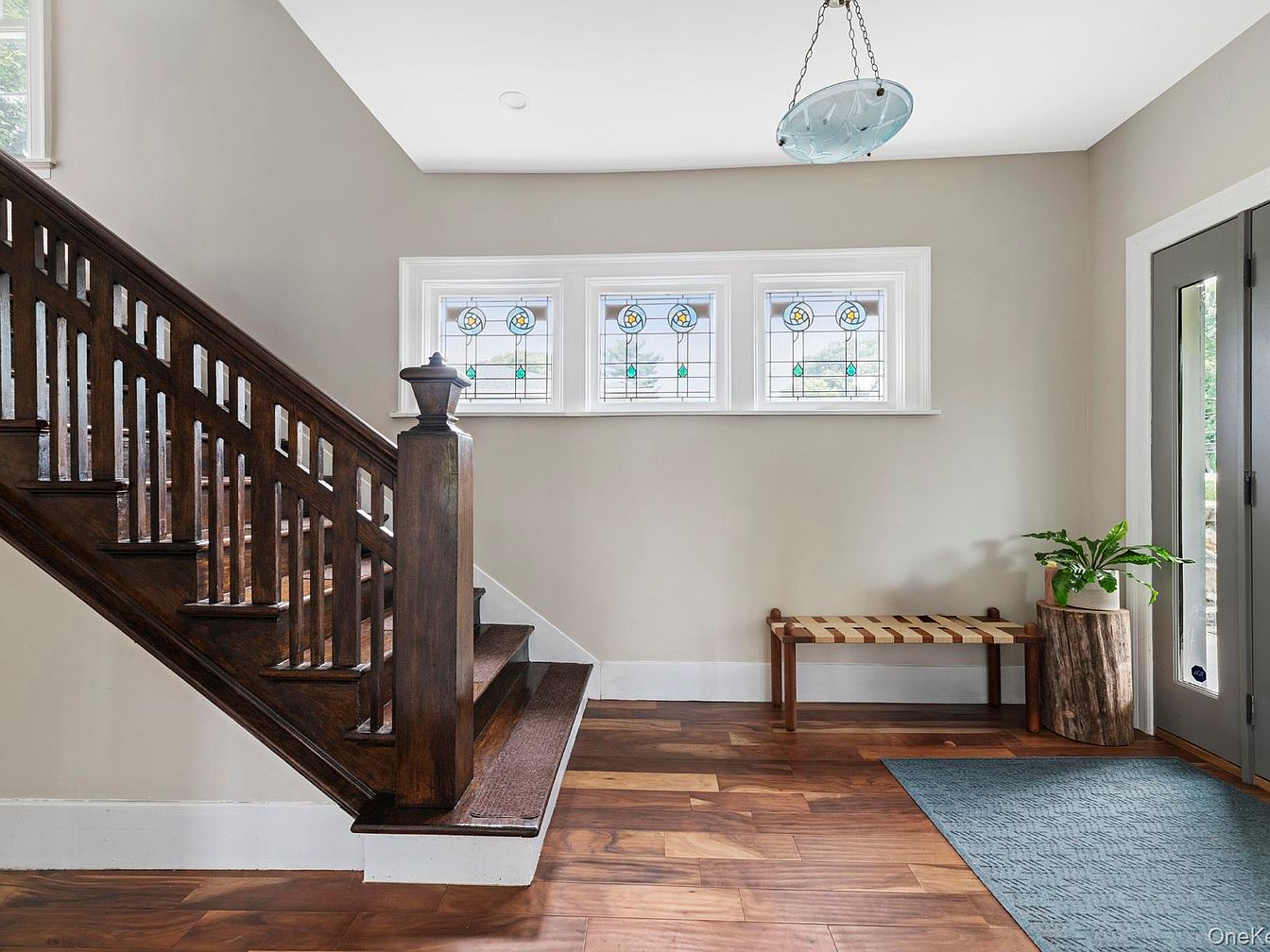 This entryway features elegant architecture with a wooden staircase showcasing rich, dark railings and spindles. The floor is adorned with polished hardwood, enhancing warmth and character. A trio of decorative stained glass windows allows soft, colorful light to filter in, adding charm. To the right, a sleek, modern door complements the traditional elements. A minimalist wooden bench with horizontal slats provides functional seating, while a natural wood stump serves as a unique table or plant stand. A soft, textured area rug in a tranquil blue hue contrasts beautifully against the warm tones of the wood, creating a welcoming atmosphere.