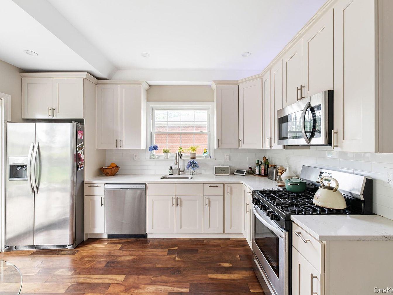 This kitchen features light beige cabinetry complemented by a striking white countertop. The stainless steel appliances, including a large refrigerator and gas stove, add a modern touch. A geometric layout maximizes space, with the sink positioned under a large window, showcasing natural light. Dark hardwood flooring contrasts with the lighter tones, creating warmth. Decorative elements include a wooden bowl filled with oranges and potted plants on the windowsill, enhancing vibrancy. The minimalist decor and efficient organization reflect a contemporary yet inviting atmosphere, ideal for both cooking and socializing.