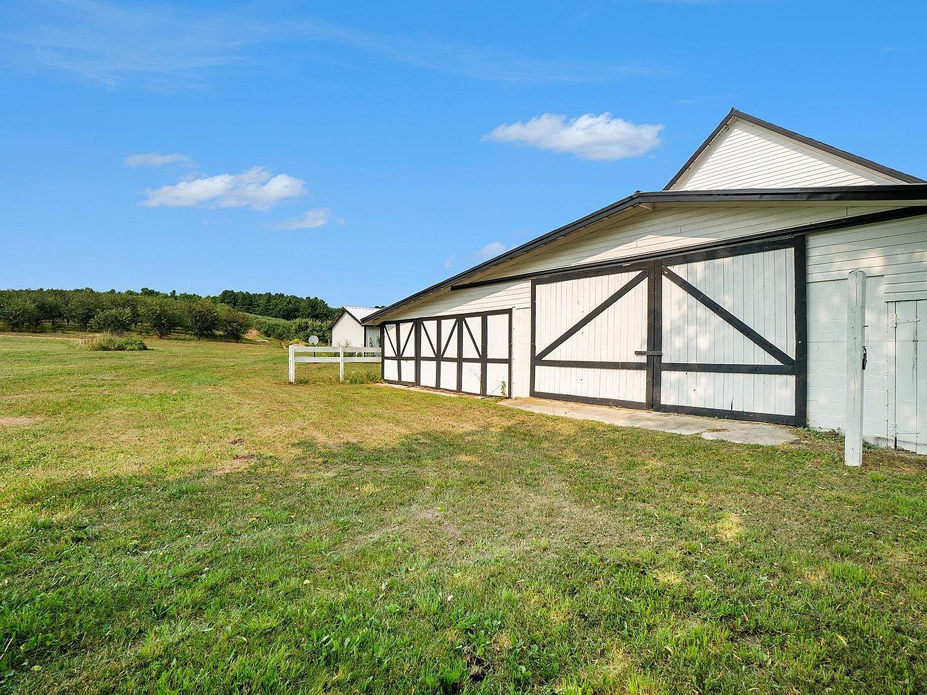 A spacious outbuilding features large, barn-style doors accented with black trim against a white wooden facade. The structure sits on a gentle grassy slope, bordered by wide open field and clear blue sky. To the left, a white fence lines part of the adjacent field, enhancing the rural, pastoral feel. Modest vegetation and clusters of distant trees provide a sense of seclusion and tranquility. The barn’s angular rooflines and the orderly symmetry of the doors convey a classic farmhouse aesthetic, blending with the natural surroundings to evoke a sense of American rural heritage and simplicity.