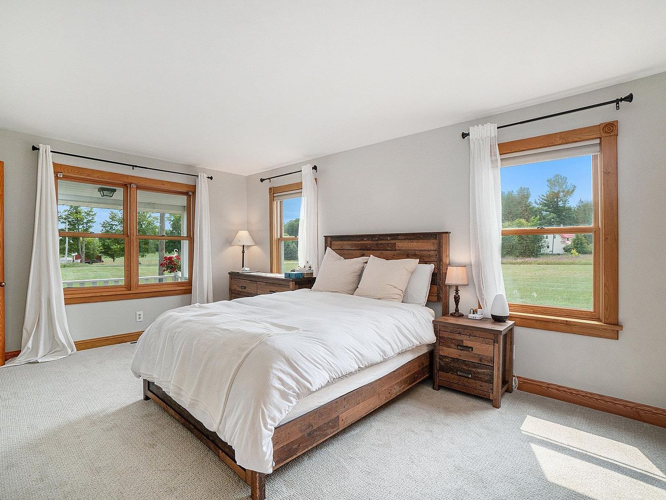A spacious bedroom featuring large windows with natural wood trim on two sides, bringing in abundant daylight and views of a green lawn and trees outside. The bed, positioned centrally against a wall, has a rustic wooden headboard and is dressed in crisp white bedding with multiple pillows. Matching wooden nightstands flank the bed, each topped with a lamp and small decorative items. The walls are painted a light neutral shade, and white curtains hang from black rods, framing the windows. The overall ambiance is bright, serene, and cozy, with soft carpeting underfoot and a balanced blend of farmhouse and contemporary accents.