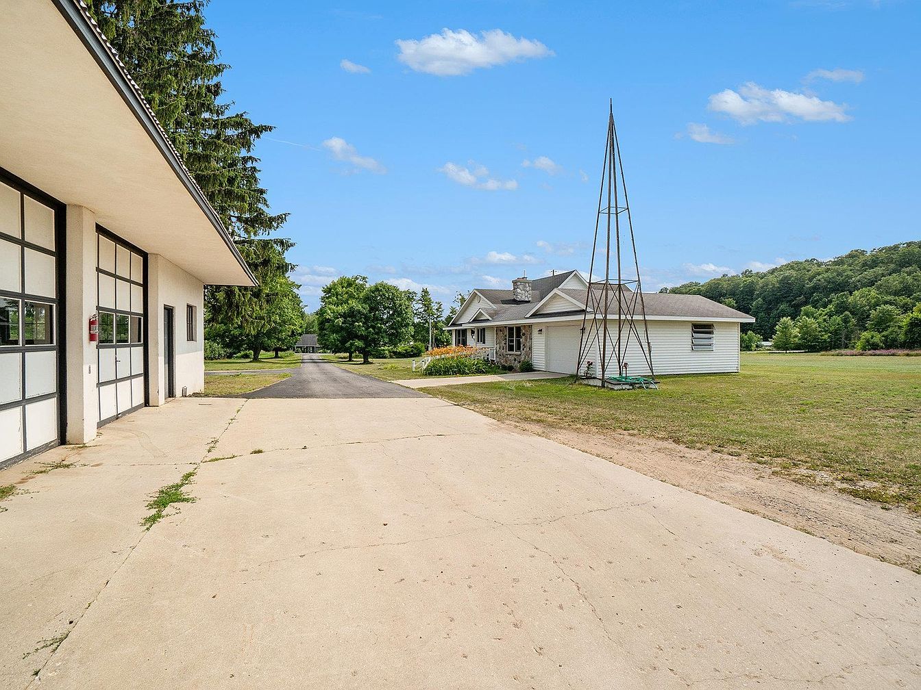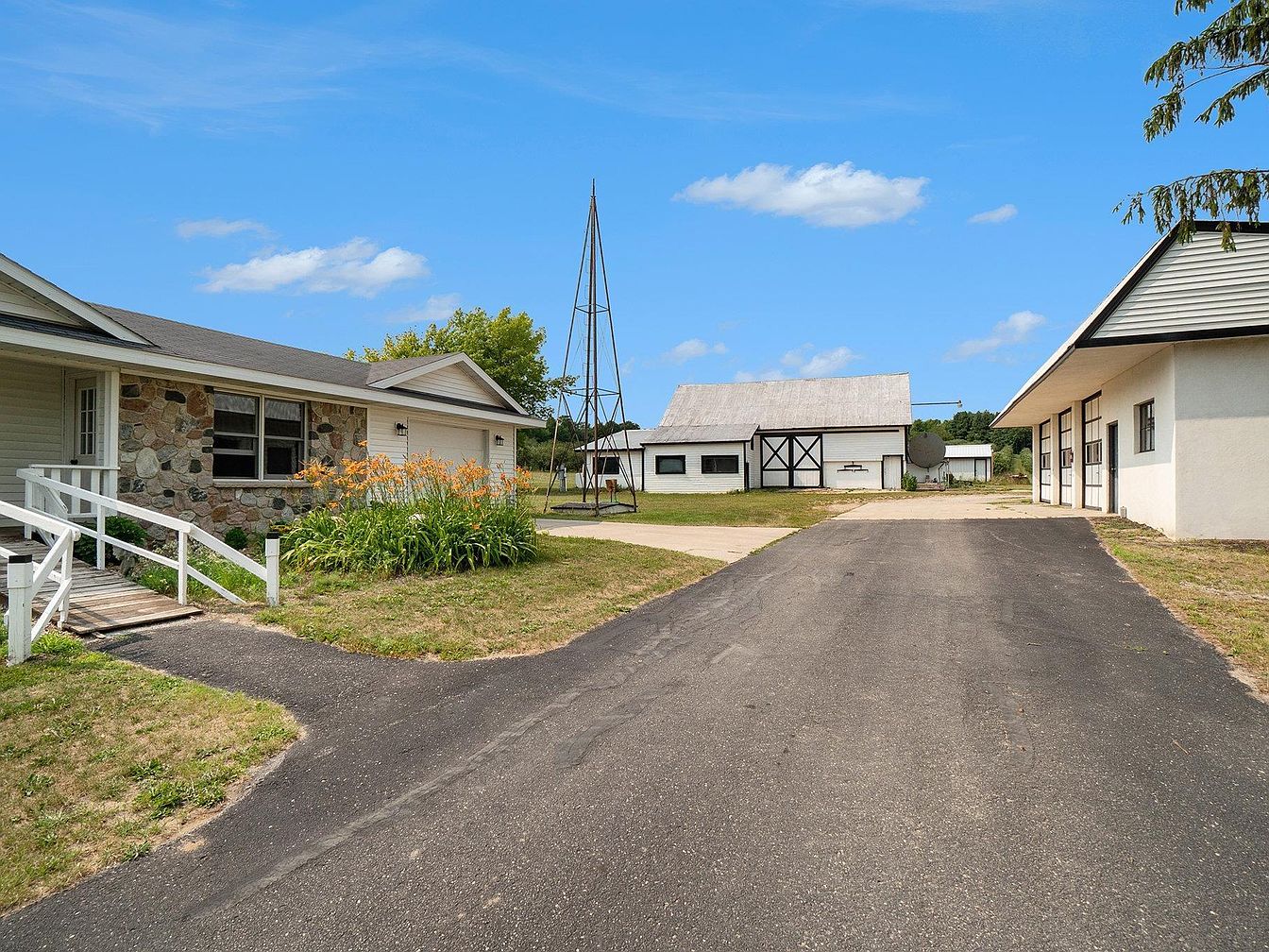 A wide asphalt driveway curves between a one-story house on the left, a multi-bay garage or workshop to the right, and a traditional barn structure further in the background. The house features a ramped wooden entry, partial stone facade, and white siding. Orange flowers and lush green foliage soften the area near the windows. The property is largely open, with manicured grass and sparse landscaping, giving a spacious and rural atmosphere. A simple open sky, minimal fencing, and a tall metal windmill structure add to the farmhouse charm and historic American country feel of the setting.