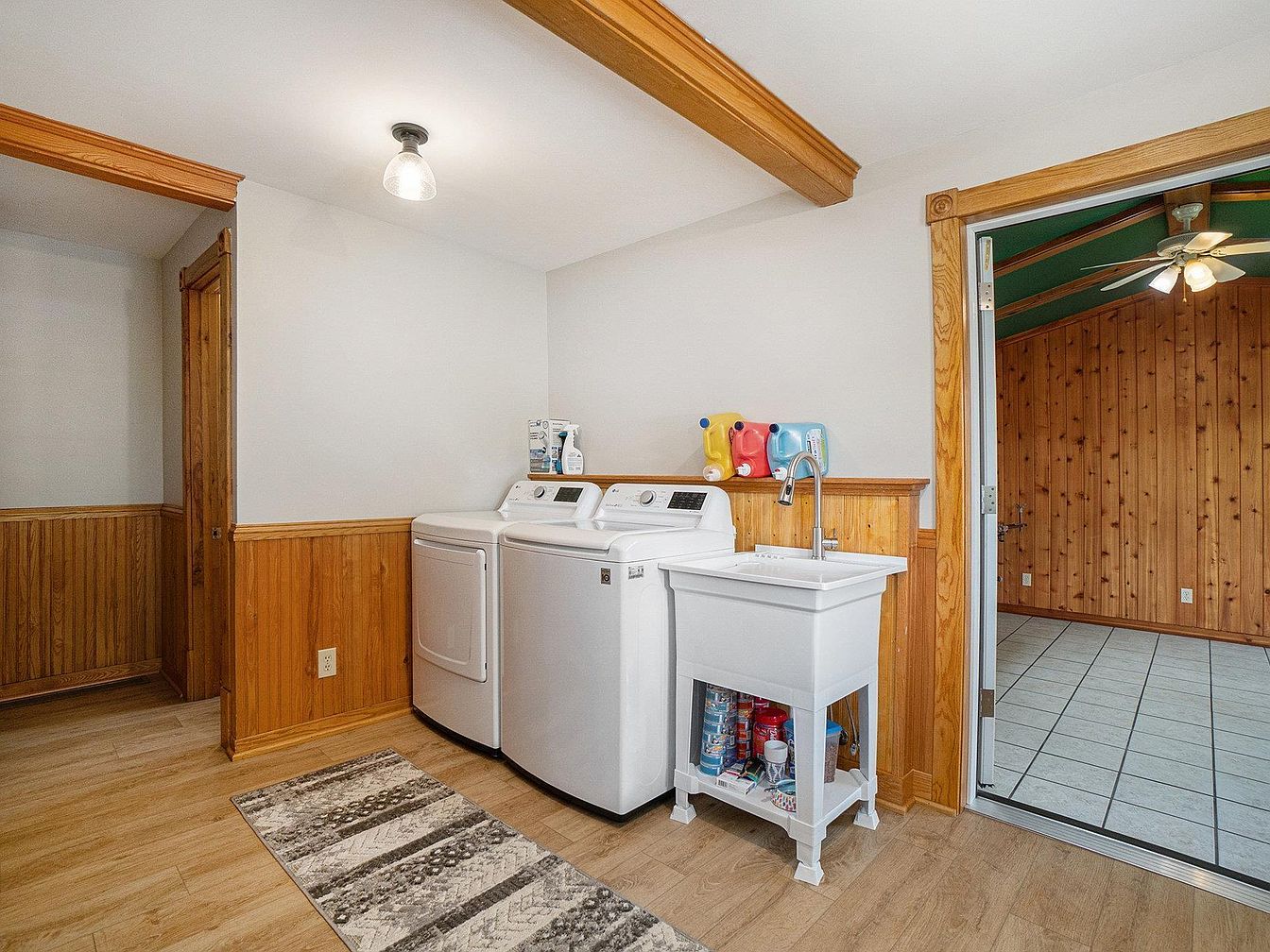 A compact laundry area featuring a white washing machine and dryer set side by side along a wall with wood wainscoting halfway up, complemented by cream upper walls. Above the machines, there are colorful detergent bottles and cleaning supplies neatly arranged. Next to the appliances, a freestanding laundry sink with an open shelf underneath stores various household items. The space is lit by a single ceiling light with a simple glass fixture, and exposed wooden ceiling beams add rustic charm. A doorway leads to a tiled room with wooden wall paneling and a ceiling fan, creating a warm, cohesive aesthetic throughout.
