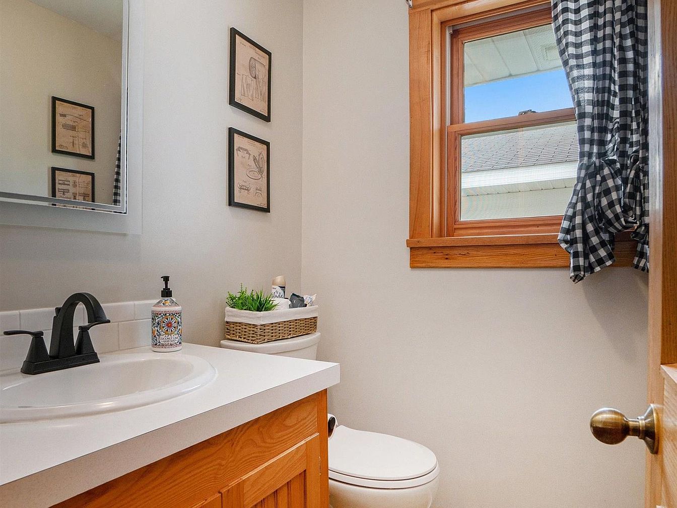 A compact bathroom with a warm and inviting atmosphere, featuring natural wood accents around the window trim and vanity. The sink area offers a white countertop and modern black faucet, complemented by a decorative soap dispenser. Above the toilet, a woven basket holds toiletries and a small faux plant for a touch of greenery. Checkered black-and-white curtains add a charming, vintage farmhouse feel to the space. Light gray walls provide a neutral backdrop, while three framed prints hang neatly above the toilet. The overall look is clean, cozy, and thoughtfully arranged for functionality and style.