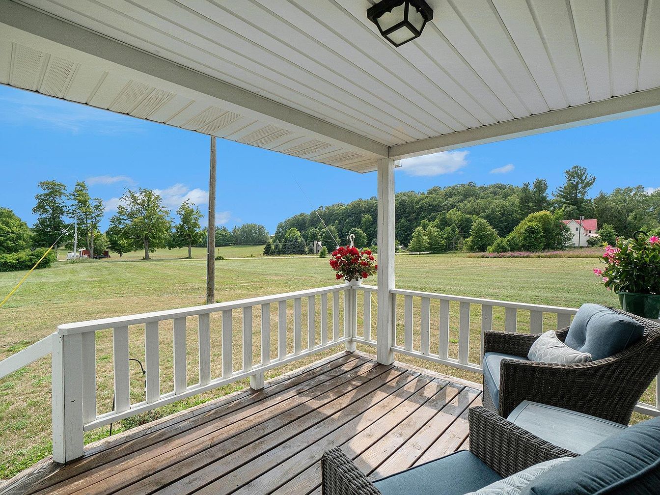 A welcoming front porch sits under a bright white ceiling with a classic square light fixture. The porch floor is made of rich, weathered wooden planks, and the white railings provide a crisp contrast. Comfortable wicker armchairs with blue-gray cushions are arranged for relaxation, accented with patterned throw pillows. Potted plants and hanging flower baskets filled with vibrant pink and red blooms add cheerful pops of color. The porch overlooks a broad, open lawn with scattered trees and a distant backdrop of forested hills under a clear blue sky, evoking a serene and inviting rural atmosphere.