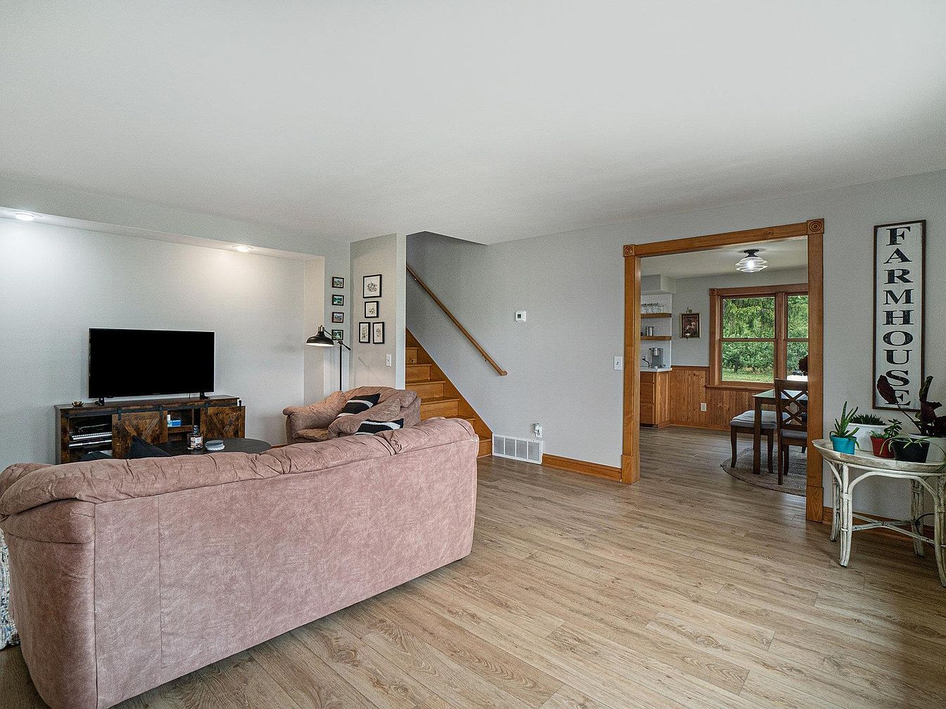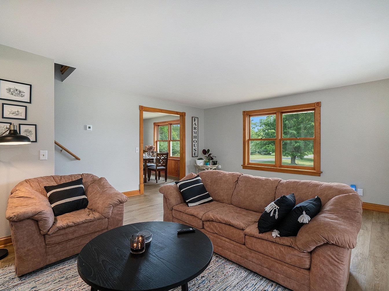 A spacious living room with pale wood flooring features a large, plush, taupe-colored sectional sofa and a matching armchair arranged to create a cozy seating area facing a flat-screen television on a wooden media console. Soft gray walls enhance the natural light, while recessed ceiling lights brighten the space. A black floor lamp sits near the armchair, next to a short wall decorated with a grouping of framed art. The space transitions smoothly into a dining area through a wooden-trimmed doorway, where large windows invite greenery views and sunlight. A white console table with potted plants and a vertical ‘FARMHOUSE’ sign add rustic charm.