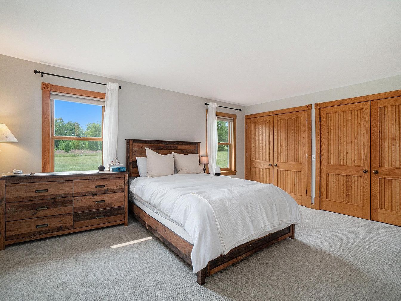 A spacious bedroom features a plush, light gray carpeted floor and neutral light gray walls. The centerpiece is a rustic wooden bed with a white comforter and two large pillows, flanked by matching wooden side tables. Two large windows with wooden trim let in abundant natural light, softened by white drapes. To the left, a wide dresser in a similar wood finish provides ample storage, topped by a lamp and small decorative items. Opposite the bed, double wooden closet doors echo the woodwork’s natural grain, giving the room a warm, cohesive, and welcoming atmosphere. The overall aesthetic is comfortable, airy, and simple.