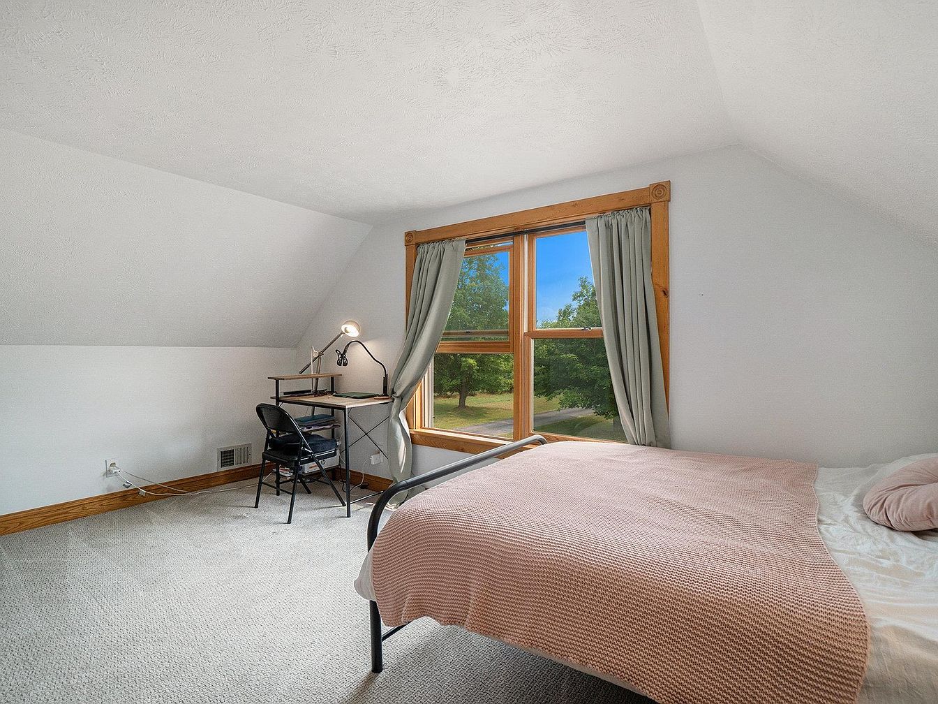 A bright bedroom features a sloped ceiling and a large window framed with light wood trim, offering views of a green lawn and trees outside. Soft gray walls and carpet create a cozy atmosphere. A metal-framed bed is neatly made with a light blush blanket and a round pastel pillow. Beside the bed, a wooden nightstand holds a modern lamp. Across from the bed, a traditional wood dresser with brass handles adds warmth. Near the window, a minimalist desk and black chair provide a workspace, softly lit by a sleek desk lamp. Curtains in muted sage complete the serene and functional design.