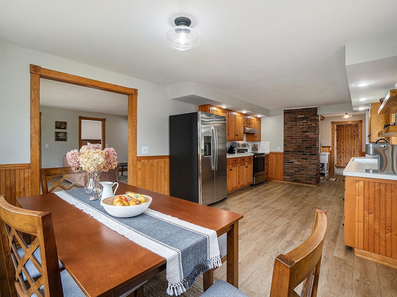 A spacious kitchen and dining area features warm wooden cabinetry, beadboard wainscoting, and light-colored walls. The floor is covered with natural-toned wood or laminate planks. A prominent stainless steel refrigerator sits beside a modern oven and cooktop, both framed by classic wooden cabinets. A rustic brick column separates spaces while adding historic character. The dining area includes a wooden table with matching chairs, set with a blue-gray runner, a white ceramic pitcher, a vase of dried hydrangeas, and a bowl of apples and bananas. Ample lighting comes from recessed lights and a simple ceiling fixture, creating a bright yet cozy atmosphere.