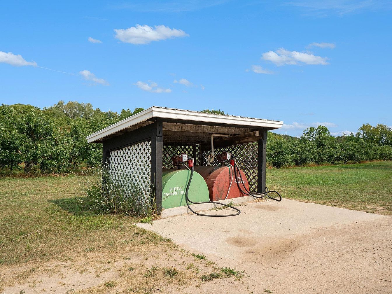 A small open-sided structure stands on a concrete pad in the middle of grassy farmland. The structure has a sloped metal roof supported by dark-painted posts, and is partially enclosed by crisscross lattice panels. Inside are two large cylindrical tanks, one green labeled for diesel and the other red for gasoline. Each tank has a hose and a pump attached. Wild grasses and weeds grow at the edges of the structure. The surrounding area is lush and green with neat rows of trees, under a sky with scattered clouds, contributing to a rural, functional aesthetic.