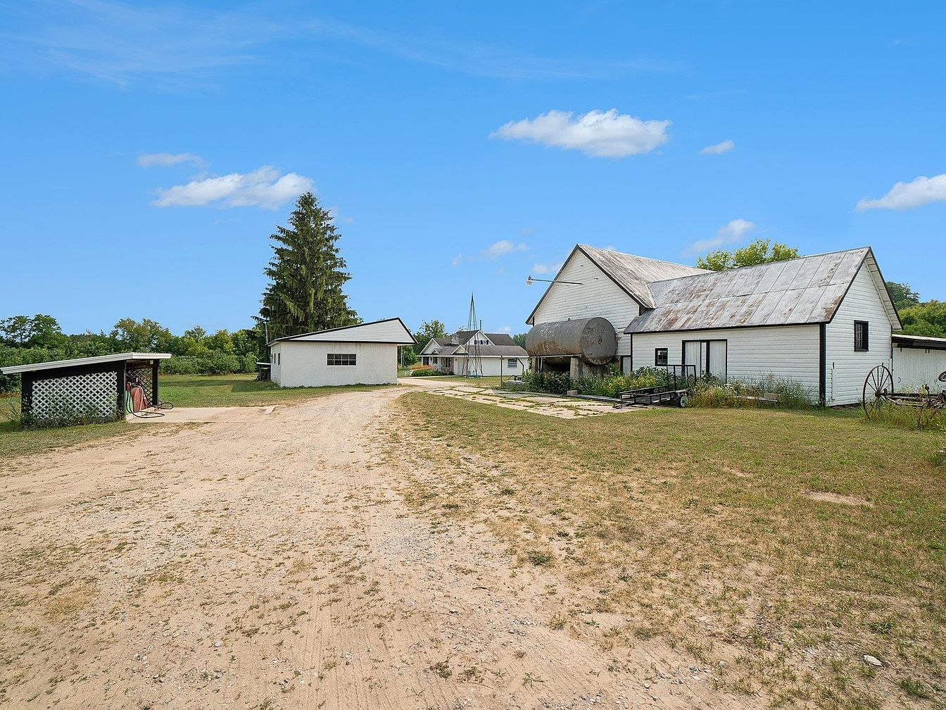 The view captures an open barnyard area of a historic rural property. A dirt driveway leads past a weathered white barn with a gray metal roof and a large cylindrical tank, hints of aging shown in rust and overgrown grass. To the left is a small outbuilding with lattice trim, holding tools and a hose, echoing the functional, agricultural purpose of the space. The layout is spacious, surrounded by open land, with a clear blue sky above and green tree lines in the distance. The overall aesthetic is rustic and utilitarian, emphasizing simplicity and practical rural living.