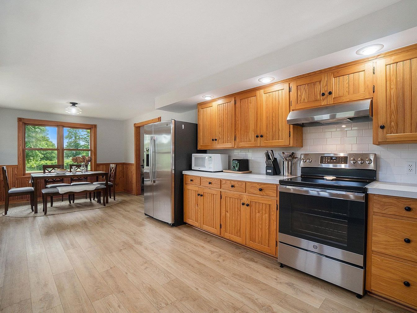 Spacious and bright kitchen with an adjacent dining nook, featuring warm honey-toned wood cabinetry and matching trim around windows and doors. Sleek stainless steel appliances, including a double-door fridge and modern oven, provide a contemporary touch contrasting with the classic shaker-style cabinets. The countertops are light-colored, complemented by a white subway tile backsplash. Under-cabinet lighting brightens the workspace. The dining area features a dark wooden table with matching chairs and a bench, positioned by large windows that frame views of lush greenery outside. Light wood plank flooring extends throughout, creating a cohesive, inviting atmosphere.