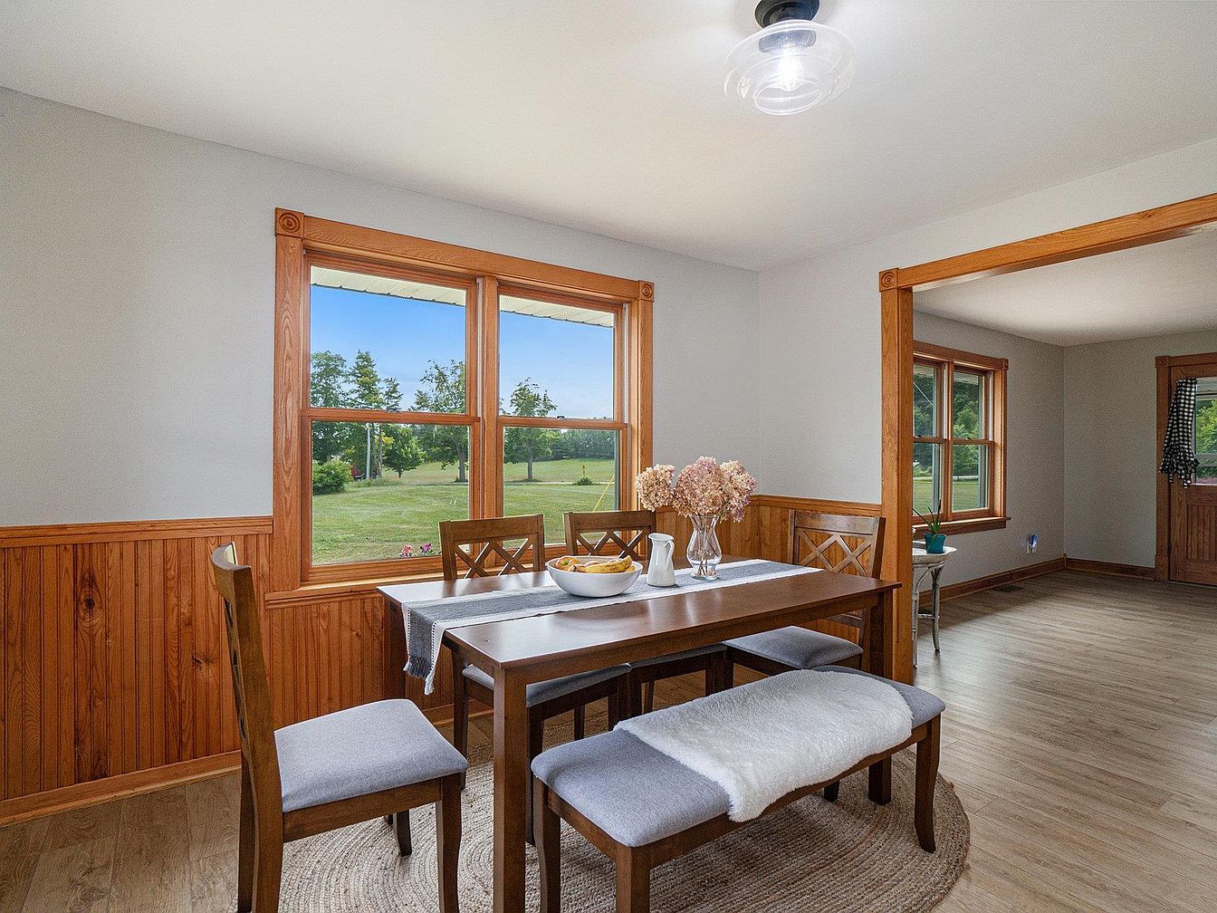 A cozy dining area features a rectangular wooden table surrounded by a mix of wooden chairs with grey upholstered seats and a matching bench draped with a white faux fur throw. The room is adorned with natural wood wainscoting that extends halfway up smooth light gray walls, creating warmth and contrast. Large double windows with rich wood trim flood the space with natural light and offer a scenic view of the outdoors. A neutral-toned woven rug anchors the table, and a simple overhead glass pendant provides illumination. The adjoining space continues the wood trim theme, enhancing continuity and charm.