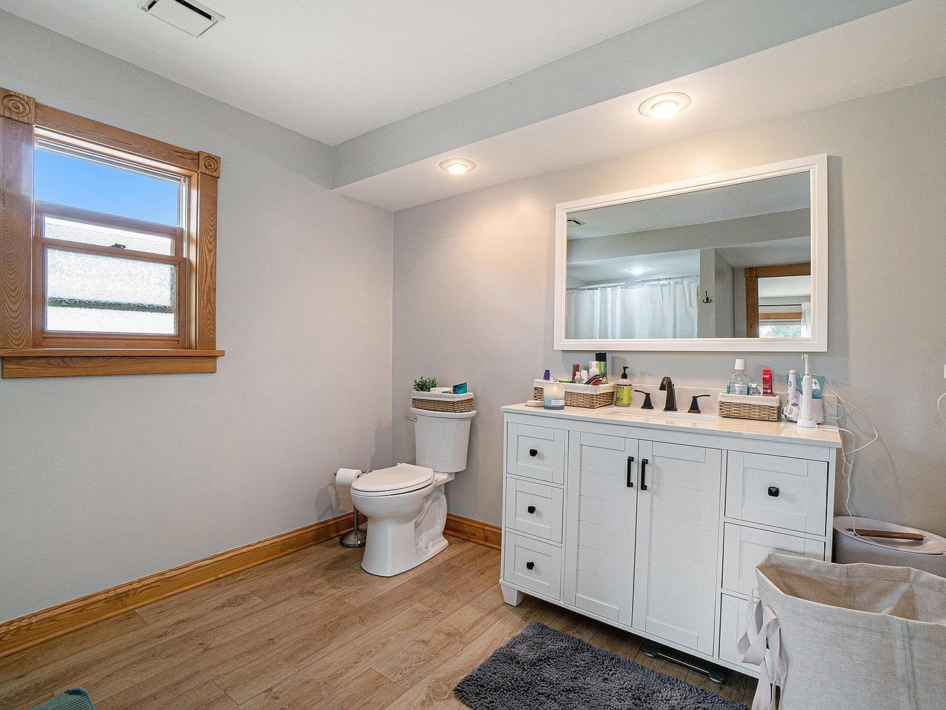 Spacious bathroom featuring a double-sink white vanity with black fixtures, topped with a large, rectangular framed mirror. The countertop holds baskets and toiletries arranged neatly, contributing to a practical yet inviting feel. A toilet sits against the left wall near a window framed in natural wood, allowing natural light to enhance the neutral color palette of pale gray walls. The flooring is wood-look laminate in a warm tone that complements the wood trim and baseboards throughout the space. Overhead recessed lighting softly illuminates the room, and a textured gray floor mat adds warmth near the vanity.