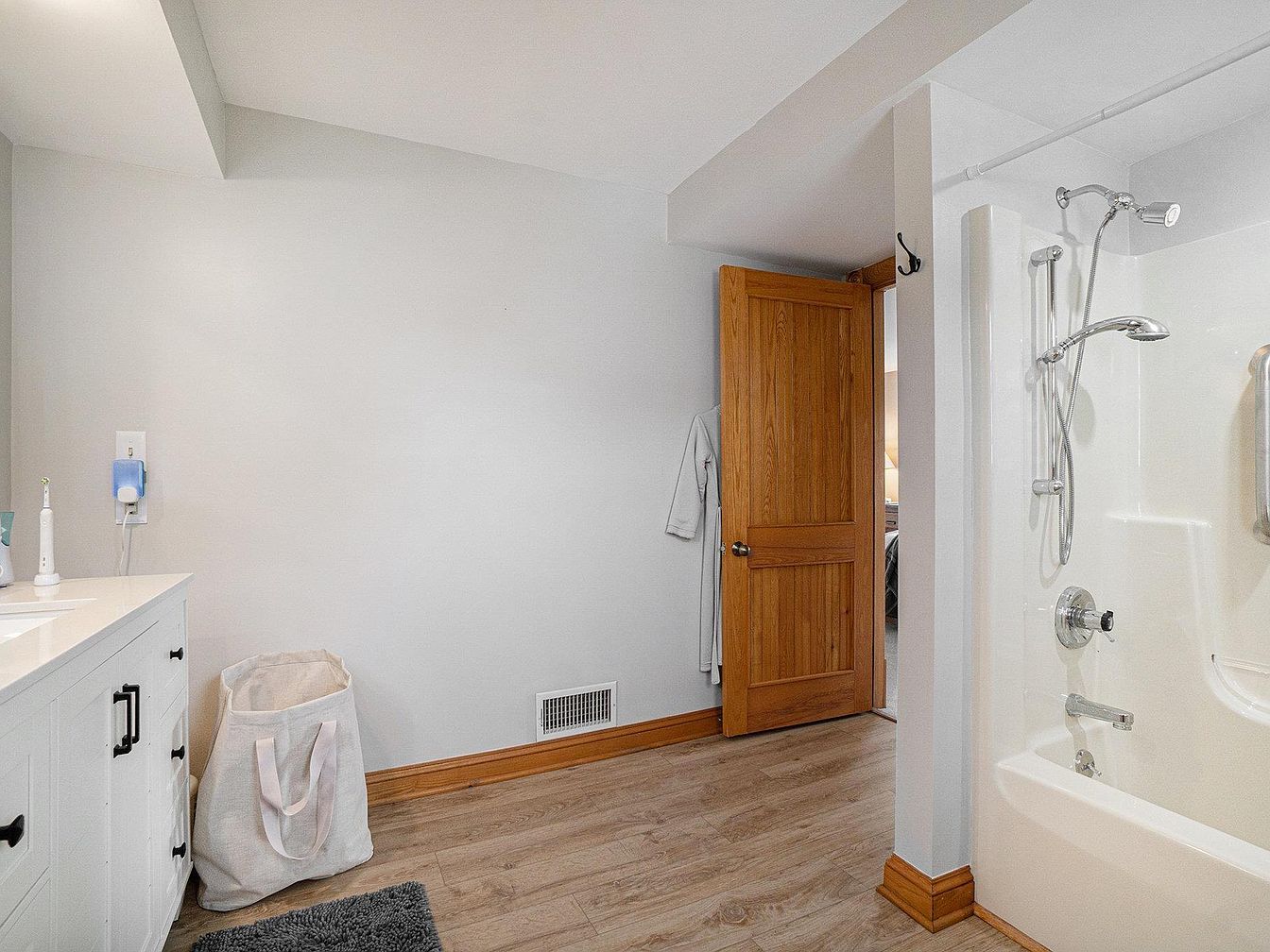 Spacious bathroom with a clean, modern aesthetic. Soft grey walls pair with light wood-look vinyl flooring and medium-tone natural wood trim. On the left, a white vanity with black hardware sits under a solid surface countertop, adorned with an electric toothbrush and soap dispenser. A fabric laundry basket rests nearby. Opposite, a white bathtub features a curved shower rod, chrome fixtures, and a handheld shower head. A wooden door with a simple knob leads to an adjacent room, just visible through the opening. The room feels airy and uncluttered, with a minimalist, calming atmosphere and practical design.