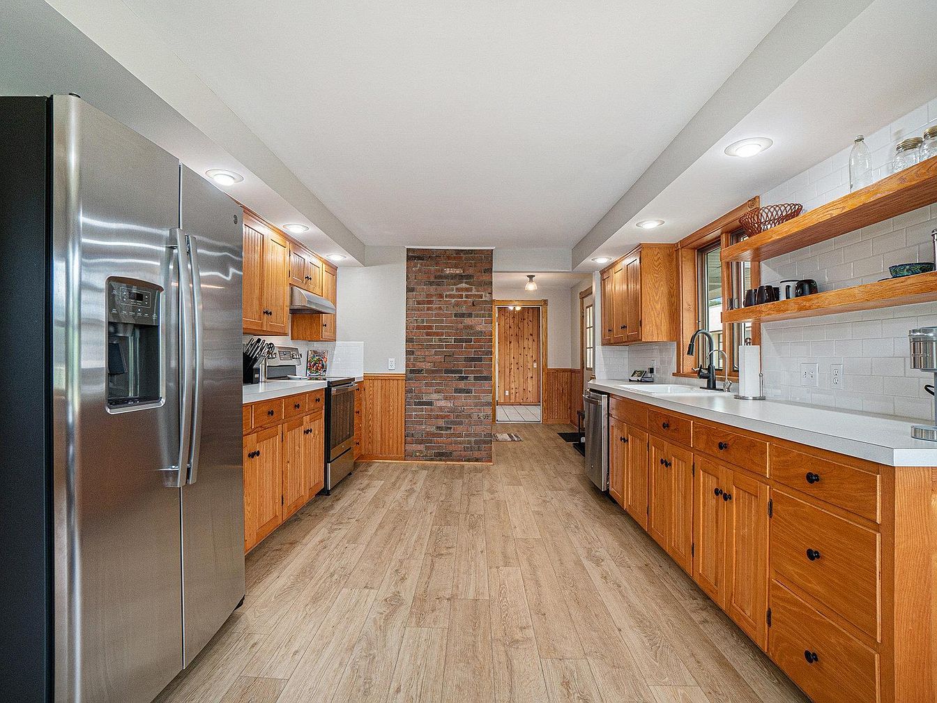 A spacious kitchen features natural wood cabinetry with black knobs, extending along both sides of the room. Stainless steel appliances, including a double-door refrigerator and a modern oven, provide a sleek, updated contrast to the warm tones of the cabinetry. White quartz countertops and a white subway tile backsplash enhance the brightness of the space, complemented by under-cabinet lighting. Open wooden shelves add visual interest and offer storage for glassware and mugs. The floor is a light wood, echoing the cabinetry. A brick accent wall at the end of the kitchen adds rustic charm, and the hallway beyond suggests an open, welcoming layout.