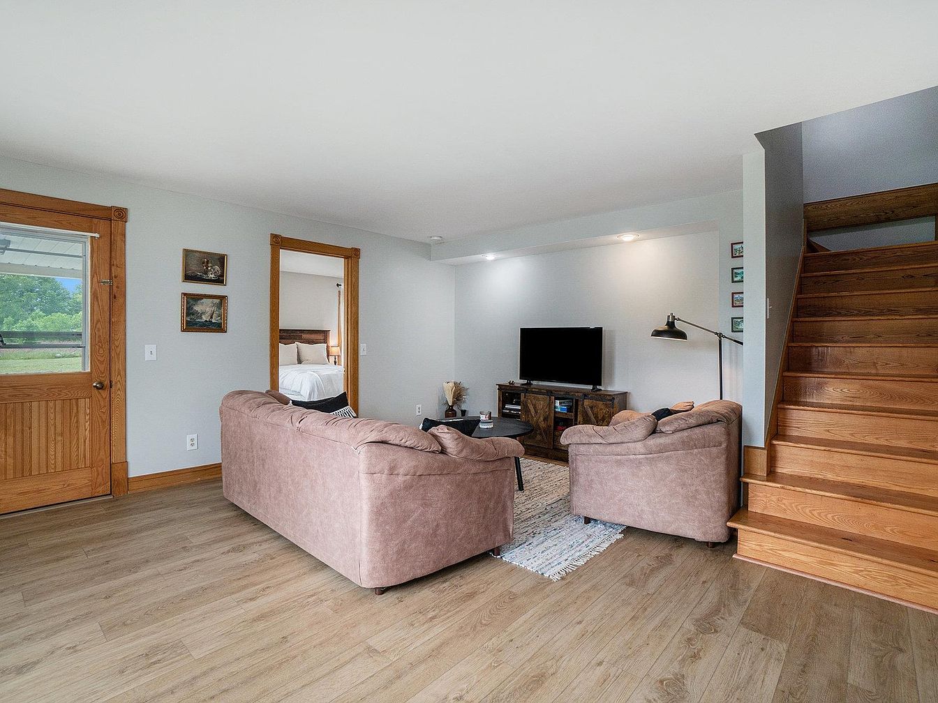 A cozy, open-concept living room features two plush taupe sofas arranged around a wooden coffee table and matching TV stand. The room is grounded by warm wood flooring and complemented by stained wood trim on the windows, door, and staircase. A staircase with broad wooden steps leads upward along the right wall. Neutral light gray walls provide a calm backdrop, with minimalistic framed artwork adding visual interest. An open doorway on the left reveals a bedroom with a neatly made bed. Recessed ceiling lights and a tall reading lamp provide soft, inviting illumination. Large windows offer views of surrounding greenery.
