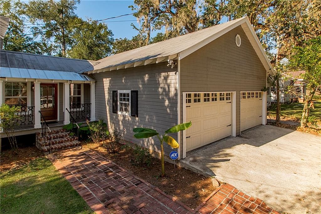 The image shows a garage attached beside a historic American home, featuring a sleek gray exterior that complements the traditional architecture. A metal roof slopes down, emphasizing a modern touch. Two large garage doors with windows provide ample light and a stylish appearance. The brick pathway leading to the entrance is edged by lush greenery, enhancing the natural aesthetic. Nearby, tropical plants like banana trees add a pop of vibrant green. The front porch is adorned with decorative iron railings, creating a welcoming atmosphere and connecting the garage harmoniously to the home.