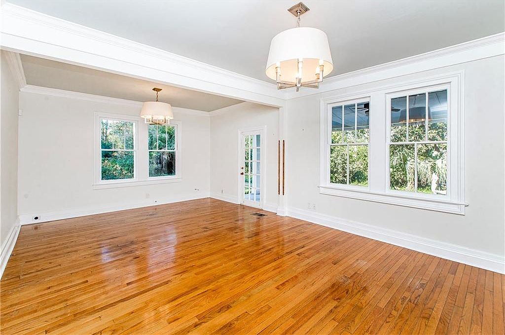 A spacious living room featuring polished hardwood floors that enhance the brightness of the space. White walls create a clean backdrop, complemented by decorative crown molding. The room is bathed in natural light from multiple large windows, offering views of the surrounding greenery. A modern light fixture hangs elegantly from the ceiling, adding a touch of sophistication. The layout is open, promoting a sense of flow between areas, while the neutral color palette encourages versatile decorating options. A subtle transition from indoor to outdoor is highlighted by a door leading to a lush garden.