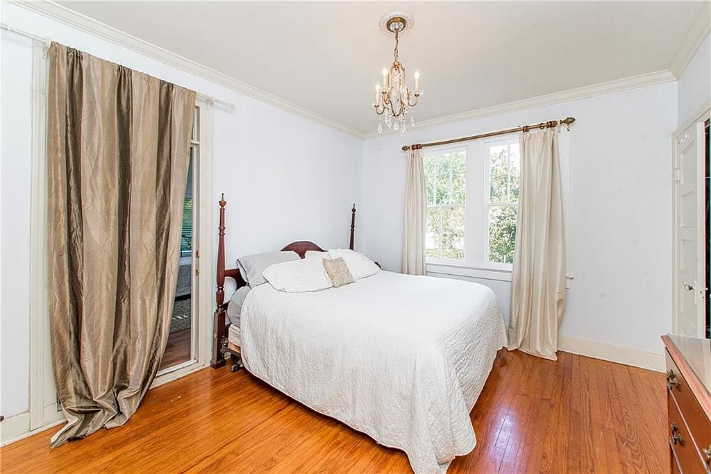 This bedroom features a serene and inviting atmosphere, highlighted by a richly hued wooden floor and soft white walls. A large, elegantly framed window allows natural light to flood the room, complementing the light-colored bedspread on the queen-sized bed. Flanking the bed are tall wooden posts, adding a touch of classic elegance. A charming chandelier provides overhead lighting, enhancing the room’s cozy feel. Sheer cream drapes frame the window, while an additional draped curtain adds textural contrast. A wooden dresser in the corner echoes the room’s warm tones, creating a harmonious and tranquil space.