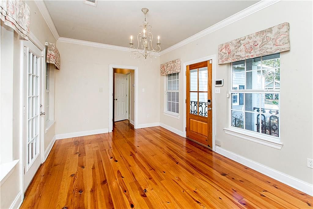 This sunroom features abundant natural light pouring in through multiple large windows, enhancing its airy atmosphere. The warm wooden flooring contrasts beautifully with the light-colored walls and ceiling, creating a cozy yet spacious feel. A simple wooden table sits in the center, complemented by a decorative piece that adds character. The angled arrangement of the windows provides a panoramic view of the outdoors, drawing attention to the greenery outside. Architectural details include classic crown molding, contributing to the home’s vintage charm. Overall, the room feels inviting and serene, perfect for relaxation or casual gatherings.