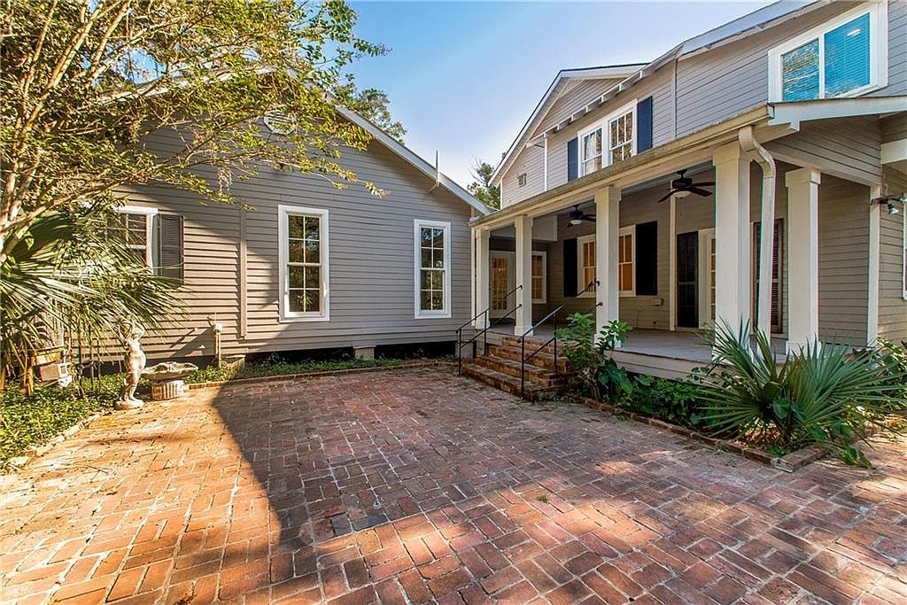 This front courtyard features a charming brick pathway leading to a spacious porch, creating an inviting entrance. Flanking the porch are two structures, one with classic white siding and symmetrical windows, adorned with black shutters. The porch, supported by sturdy white columns, is detailed with ceiling fans for ventilation. Lush greenery surrounds the area, with palm plants adding a tropical flair. Natural light bathes the space, emphasizing the warm tones of the brickwork. This combination of architectural elements and greenery creates a harmonious blend of comfort and elegance, perfect for enjoying the outdoors.
