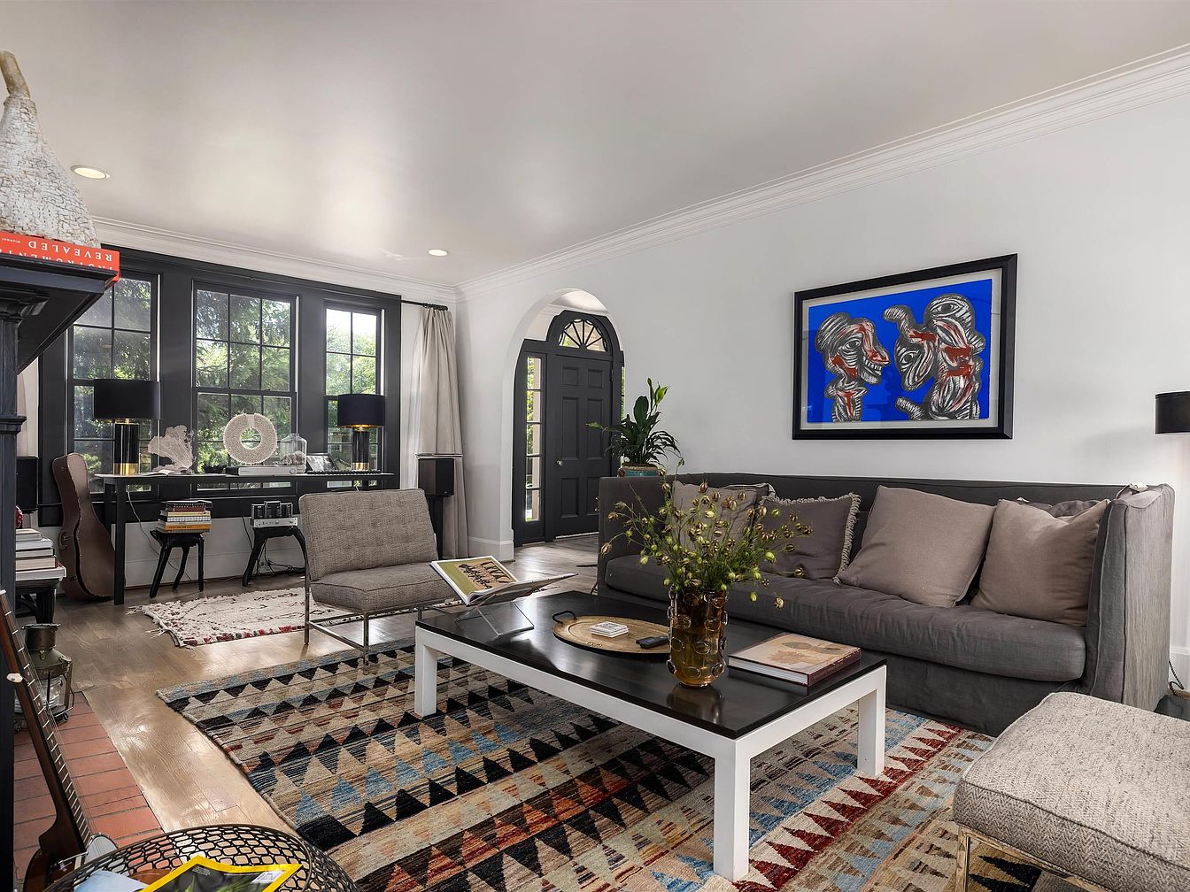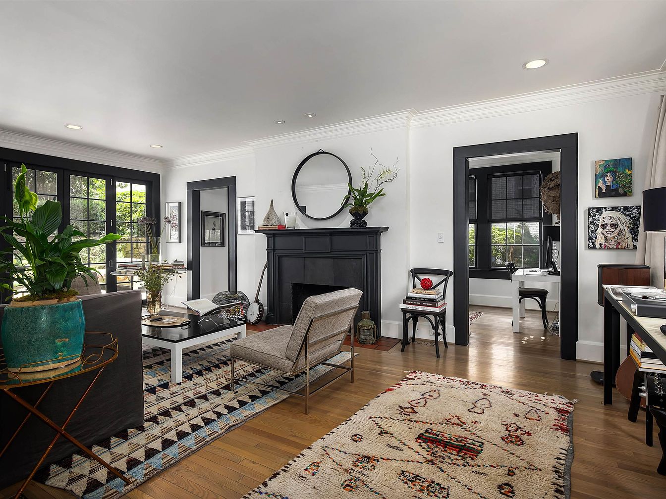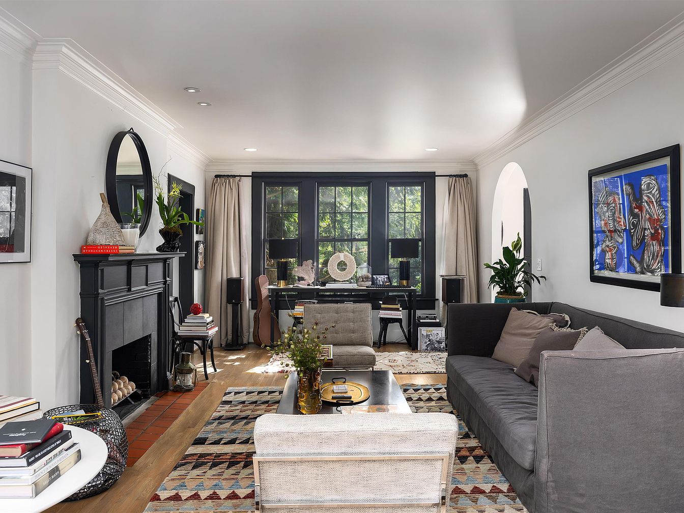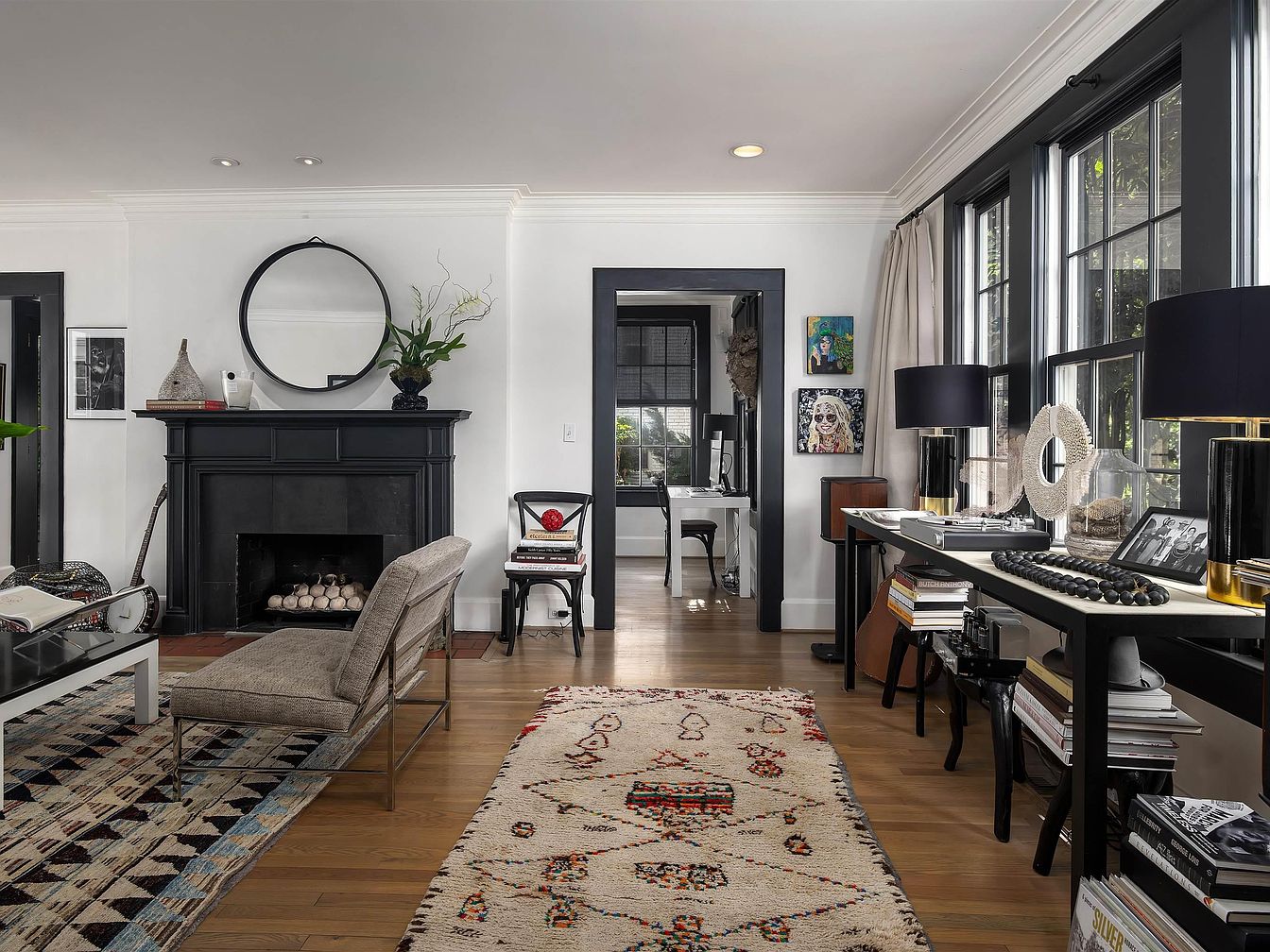 The living room features a modern, stylish atmosphere with a blend of classic and contemporary elements. Rich hardwood floors complement the neutral walls, while expansive black-framed windows invite natural light. A plush, gray accent chair and a minimalist coffee table anchor the space, accented by vibrant artworks on the walls. A striking black fireplace, adorned with a round mirror, serves as a focal point. Decorative touches include a large potted plant, an eclectic area rug with geometric patterns, and playful decor items, creating an inviting atmosphere that balances sophistication with warmth.