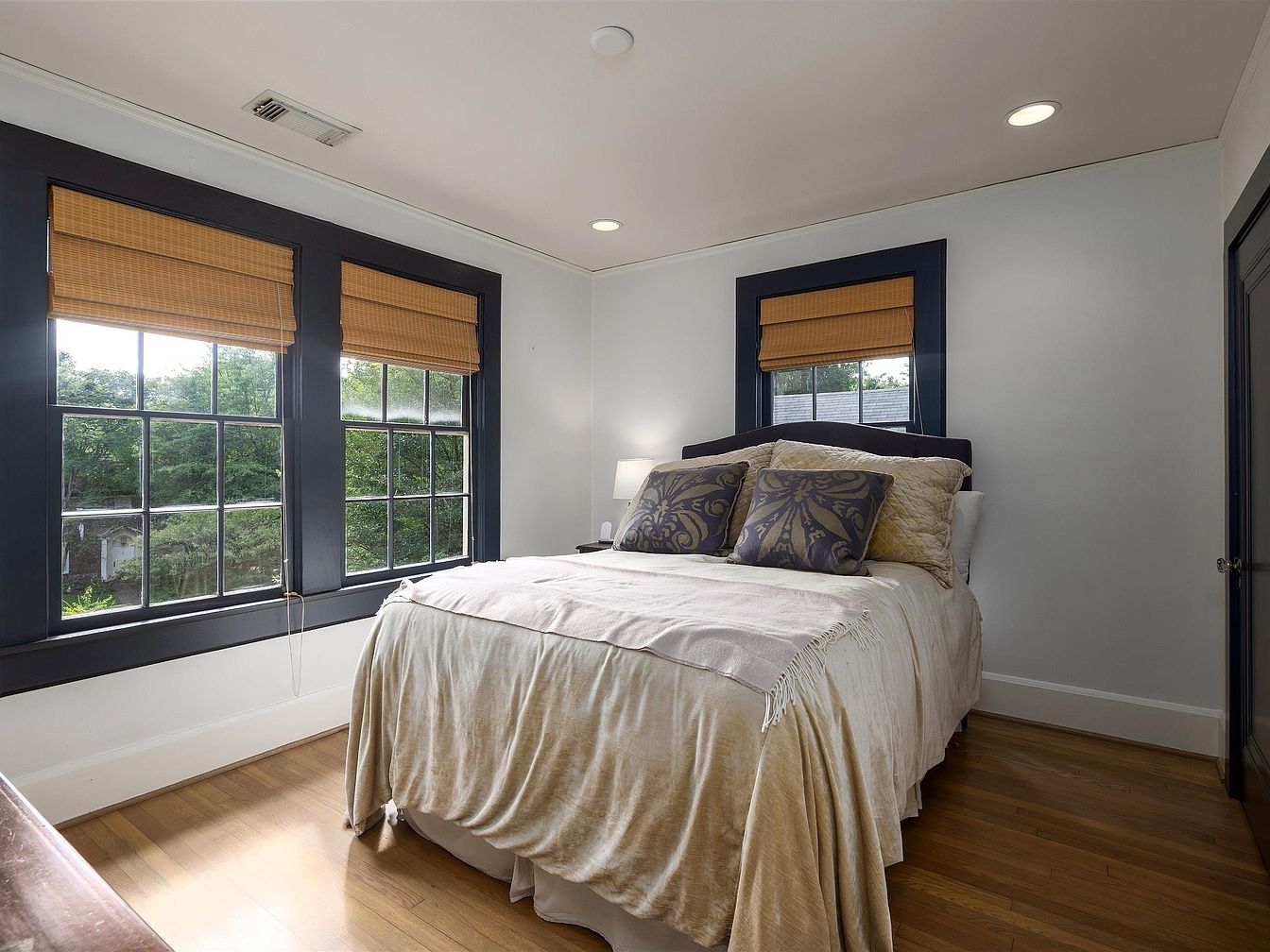 This cozy bedroom emphasizes a serene retreat aesthetic. The soft beige bedspread drapes elegantly over the queen-sized bed, adorned with decorative pillows that feature rich, dark patterns, adding texture and sophistication. Light pours in through large double-paned windows with bamboo shades, framed by contrasting deep navy blue trim that lends a modern touch. The hardwood floor enhances warmth and complements the room’s neutral color palette. A sleek bedside lamp casts a gentle glow, while a dark door offers access to additional spaces. The overall ambiance conveys comfort and understated elegance, ideal for relaxation.