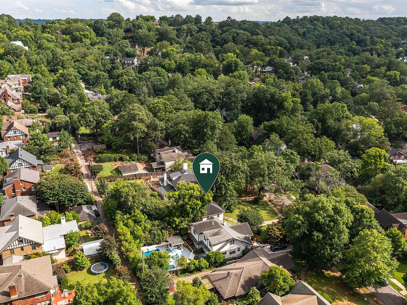An expansive aerial view captures a historic American neighborhood, richly adorned with lush greenery. Traditional homes, varied in architectural style, fit harmoniously among the trees. Paved streets meander through the area, bordered by manicured lawns and gardens. The houses showcase gabled roofs and charming facades, blending rustic charm with modern elements. Distant views of a swimming pool suggest leisure options. The vibrant canopy of trees creates a serene atmosphere, while sunlight filters through the foliage, enhancing the tranquil environment. This picturesque setting embodies a sense of community nestled within nature.