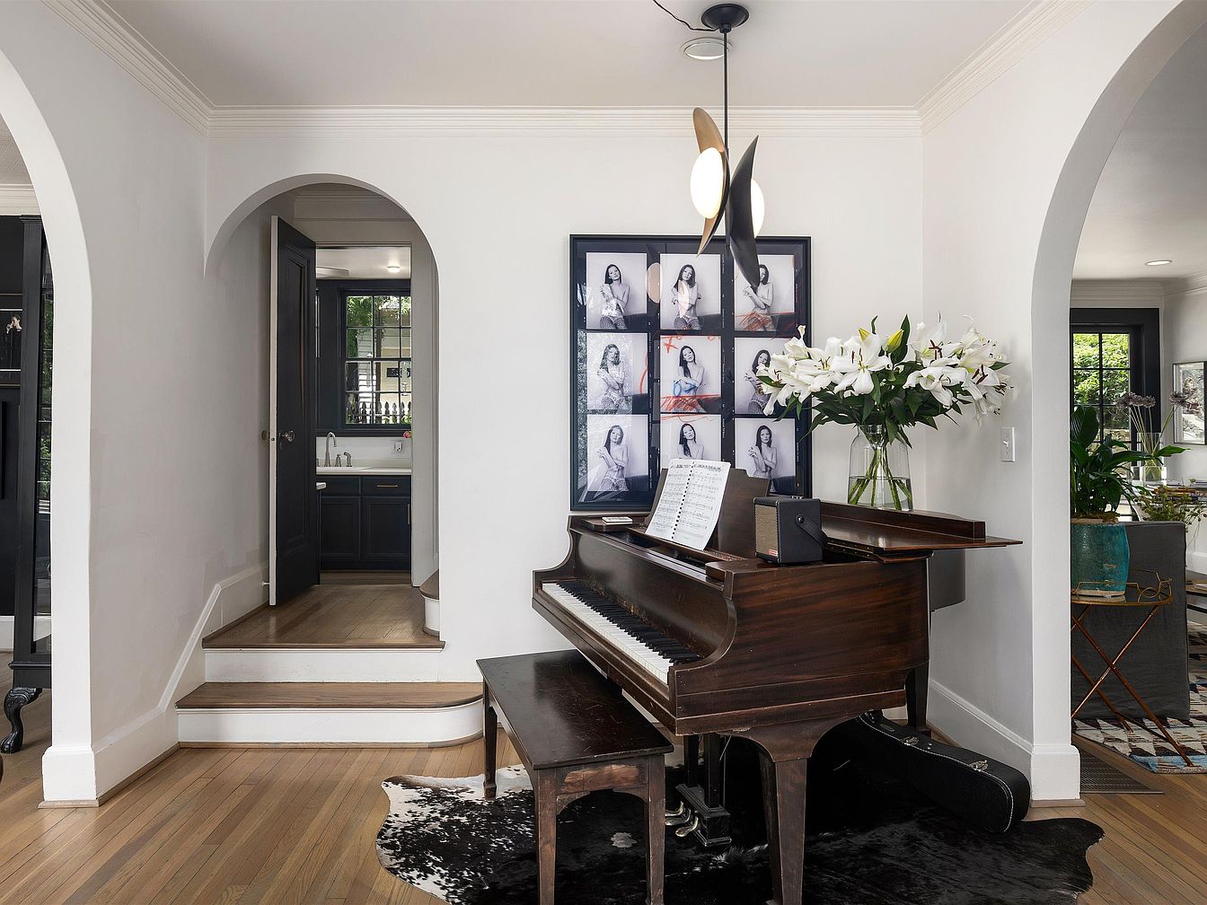 This entryway features elegant archways that lend a classic charm, flanked by a wooden piano. The space is illuminated by a modern pendant light, enhancing the contemporary aesthetic. Walls are painted in a soft white, contrasting beautifully with dark cabinetry visible through the arched passage. A vibrant arrangement of white lilies sits on the piano, adding a fresh touch. Light hardwood floors lead to a carpet with an abstract design, further enriching the texture of the space. Adjacent, a hint of greenery peeks through the doorway, creating a seamless connection with nature.