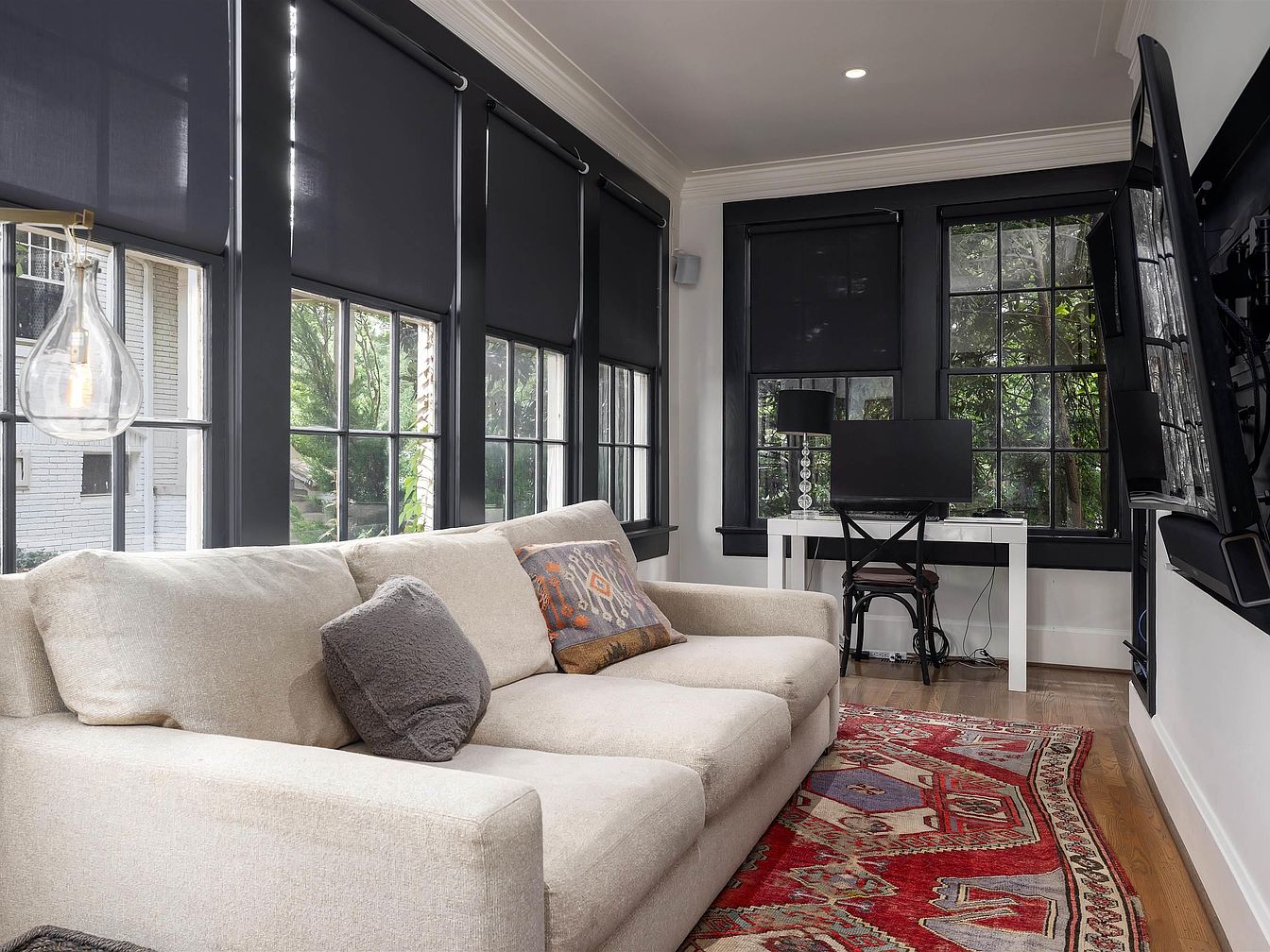 A bright corner of a living room, featuring large, dark-framed windows that allow natural light to flood in, creating an inviting atmosphere. Soft, cream-colored couch with plush throw pillows offers comfort. A vibrant, patterned area rug adds warmth and contrasts beautifully against the polished wooden floor. A sleek, modern desk with a monitor and a stylish lamp creates a functional workspace in the corner. The minimalist design is accentuated by a contemporary light fixture hanging above. Overall, the space harmonizes modern aesthetics with traditional elements, fostering a cozy and productive environment.