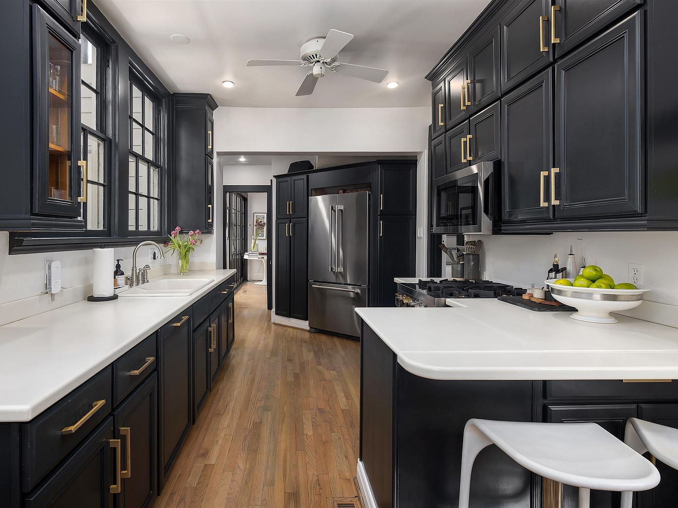 This kitchen features sleek black cabinetry with gold hardware, creating a modern yet classic aesthetic. A long white countertop runs alongside a double sink, offering abundant workspace. Large black-framed windows allow natural light to flood in, illuminating the rich wood flooring. The layout includes a kitchen island with a curved countertop, complemented by minimalist white stools, fostering an inviting atmosphere. An array of pots and pans can be seen above the stove, hinting at culinary potential. Decorative touches like a vase with fresh flowers and a bowl of green apples add a lively, warm touch to the contemporary design.
