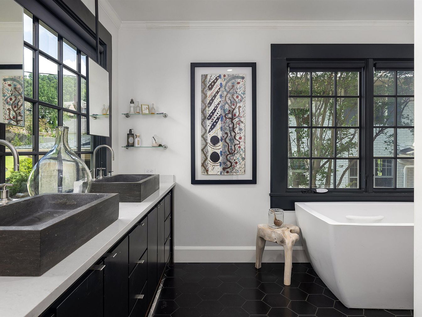 This modern bathroom features a sleek design with a dark color palette. Dual under-mount sinks made from black stone sit atop a light gray countertop, contrasting elegantly with the rich black cabinetry. Large windows framed in black allow abundant natural light, illuminating the room’s minimalist décor. A striking piece of art adds a pop of color against the white wall. Opposite the sinks, a freestanding bathtub boasts smooth, curved lines, creating a serene focal point. Small glass shelves provide functionality without clutter, enhancing the spacious feel, while hexagonal floor tiles lend an artistic touch to the overall aesthetic.