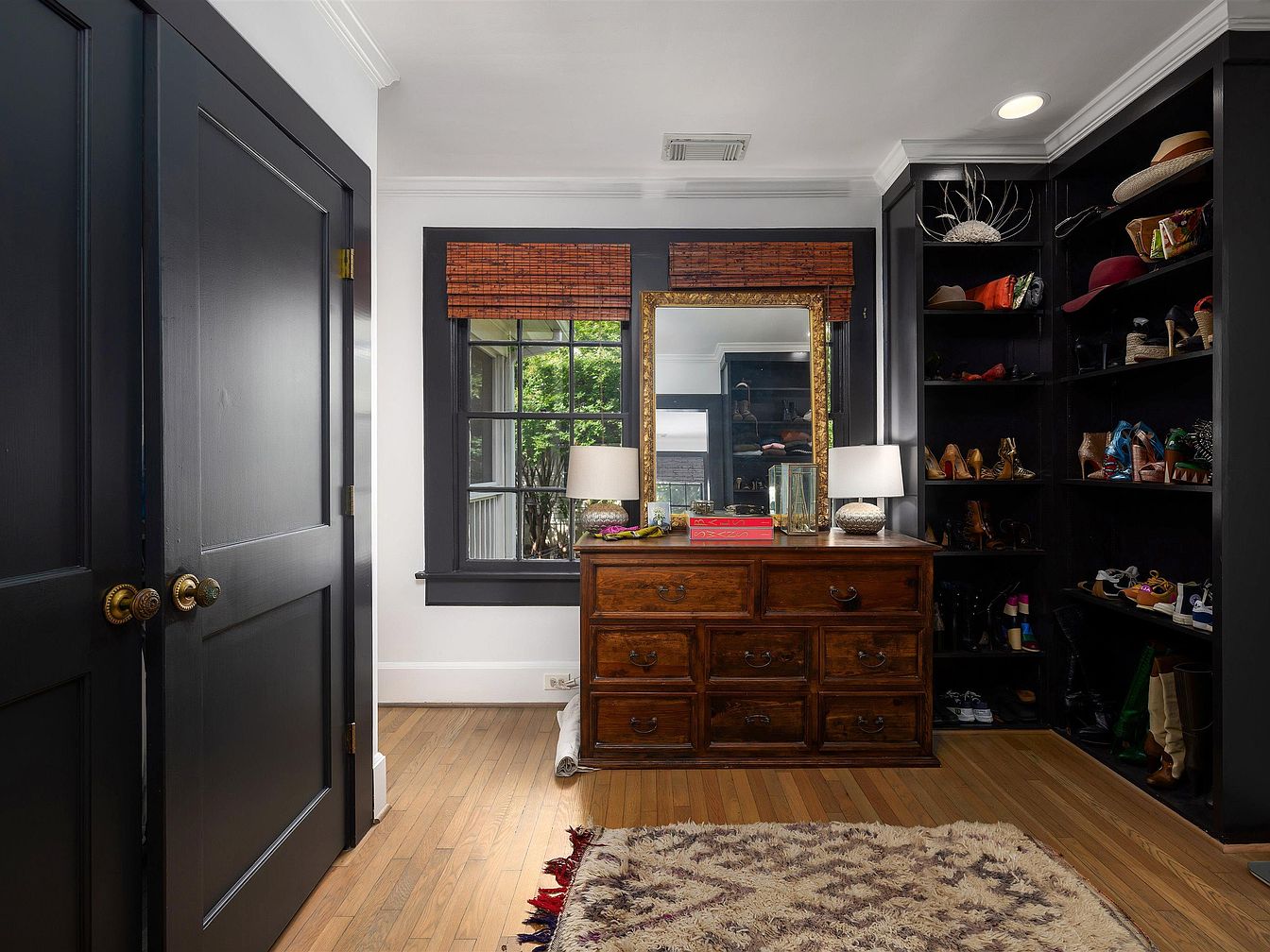 A cozy dressing room featuring a dark wood dresser against a soft contrast of light walls. The dresser showcases classic brass handles and is topped with a decorative mirror framed in ornate gold. A stylish lamp next to the mirror adds a warm glow. To the right, a built-in shelving unit displays a wide array of colorful shoes and accessories, including hats, creating an accessible and chic storage solution. Large, dark-framed windows with bamboo shades allow natural light to filter in, enhancing the earthy aesthetic of the wooden floor and woven area rug that adds texture beneath.