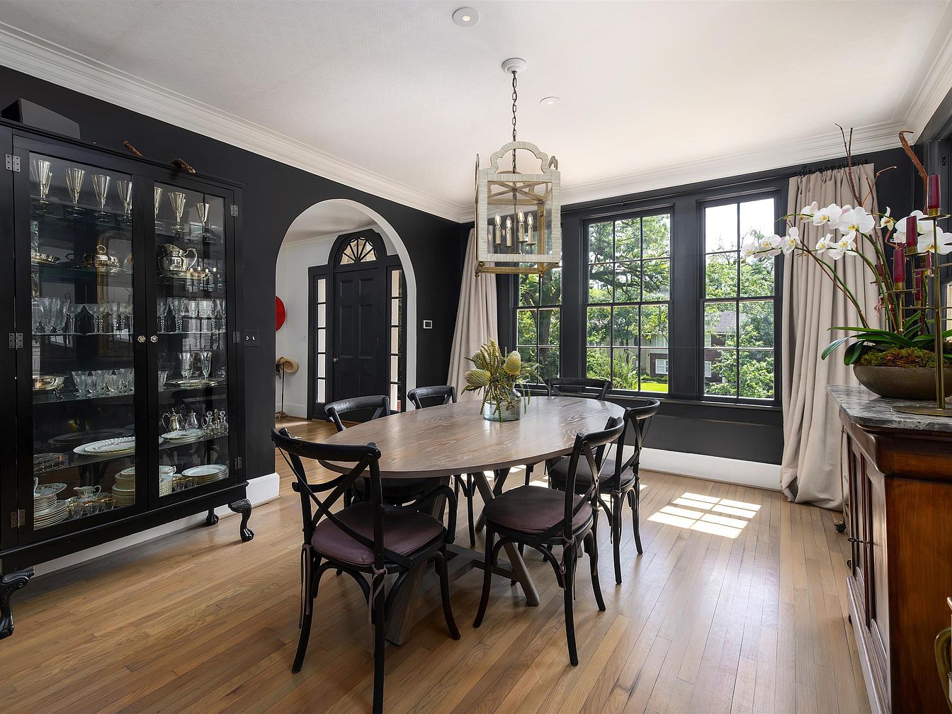 This dining room features a harmonious blend of modern and classic aesthetics. The dark black walls create a striking contrast against the light natural wood floor, enhancing the warmth of the space. A round wooden dining table, surrounded by elegant black chairs with cushioned seats, encourages intimate gatherings. A glass display cabinet showcases a collection of fine glassware, reflecting light and adding sophistication. Architectural details include an arched doorway leading to another space, and large windows framed with soft drapes, inviting natural light in. A unique lantern fixture hangs from the ceiling, providing ambient lighting.