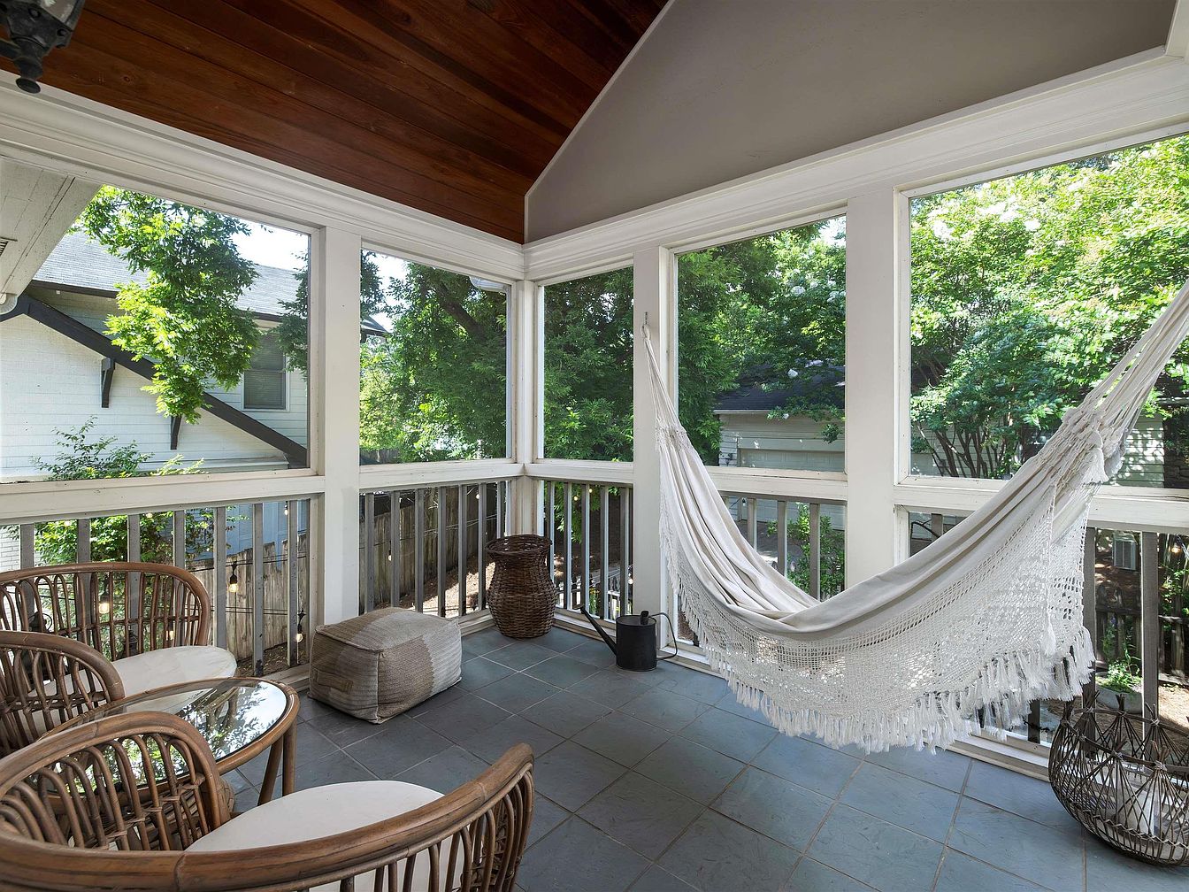 This screened porch features a cozy atmosphere with a combination of natural light and greenery from outside. The ceiling is elegantly adorned with wooden beams, creating warmth and character. Rattan chairs with soft cushions encircle a small glass-top table, providing a relaxed seating arrangement. A knitted hammock hangs from the posts, inviting leisure and tranquility. The flooring consists of large, gray tiles that harmonize with the earthy tones of the decor. A woven basket adds texture, while scattered greenery outside enhances the connection with nature. The overall aesthetic promotes comfort and a serene outdoor experience.