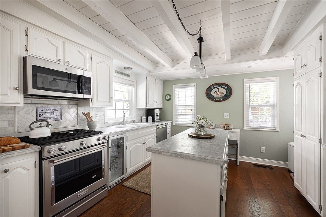 Spacious kitchen features white cabinetry and dark hardwood floors, creating a warm contrast. The ceiling showcases exposed beams, enhancing the room’s character. A marble countertop serves as a central island, topped with a simple vase of flowers, adding a touch of elegance. Modern appliances, including a sleek black stove and stainless steel refrigerator, complement the classic design. Natural light filters through the multiple windows, paired with light green walls that provide a calming atmosphere. Decorative elements, like a vintage sign and artwork, add personality, making this kitchen both functional and inviting.