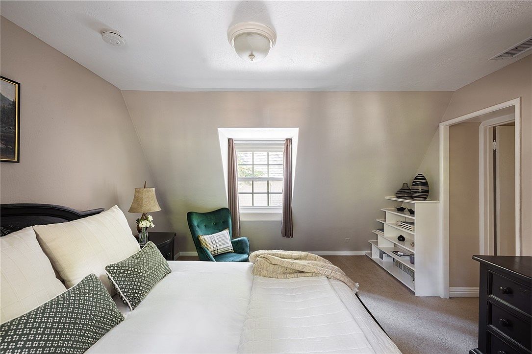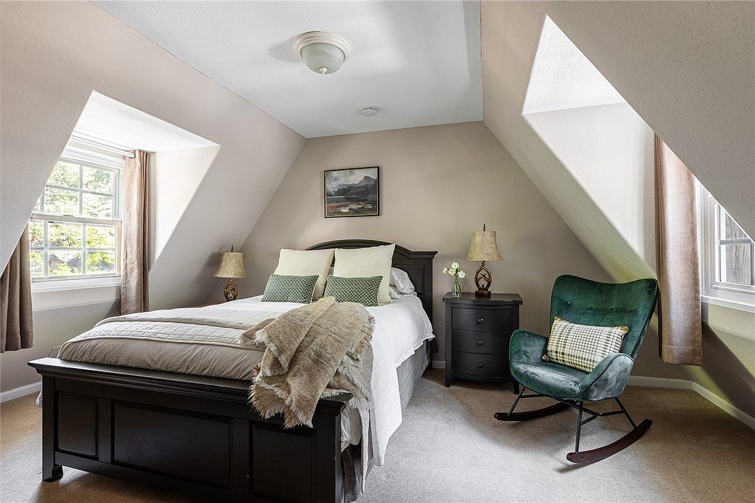 This cozy bedroom features sloped ceilings and a warm neutral color palette. A plush bed dressed in white linens and a textured throw dominates the space, flanked by two soft-glow table lamps on black nightstands. A vibrant green rocking chair, decorated with a patterned cushion, adds a pop of color. Natural light filters through the windows, accented with beige curtains, highlighting the subtle architectural angles. A small piece of art depicting a serene landscape adorns the wall, enhancing the room’s tranquil ambiance. A carpeted floor provides warmth, making the space inviting and comfortable.