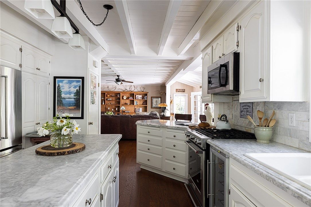 The kitchen features a spacious layout with a central island topped in elegant marble, providing ample prep space. Crisp white cabinetry and stainless steel appliances blend seamlessly, reflecting a modern yet classic aesthetic. Exposed wooden beams add character to the ceiling, enhancing the room’s warmth. The dark hardwood floor contrasts beautifully with the lighter color palette, creating a welcoming atmosphere. A large window allows natural light to flood in, providing a serene view of the neighboring space. Decorative elements like a vase of fresh flowers and cooking utensils add charm, emphasizing functionality and style in this inviting kitchen.