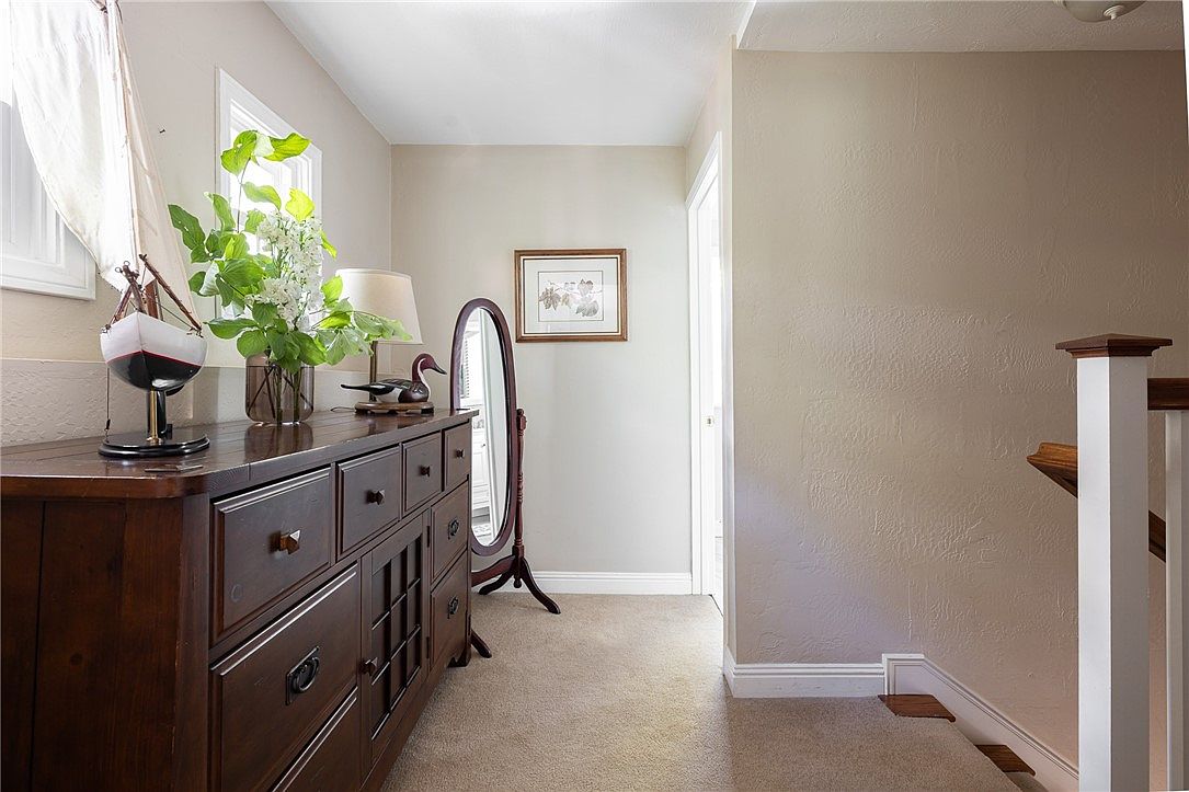 The entryway features a warm, inviting atmosphere with neutral beige walls complemented by carpet flooring. A dark wooden sideboard, adorned with decorative items, serves as a focal point, while a large, elegant mirror leans against the wall, enhancing the sense of space. A table lamp provides soft lighting, and a vase with fresh greenery adds a touch of vibrancy. On the wall, a framed artwork introduces subtle colors, creating visual interest. The staircase to the right, with wooden handrails, leads to the upper floor, inviting guests into the home and reflecting a blend of classic and contemporary design elements.