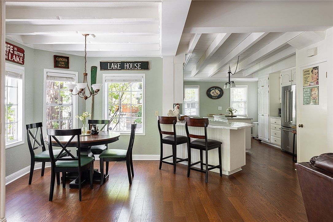 This cozy dining area features a round black table surrounded by green-upholstered chairs, offering a relaxed setting for meals. Light pours in through multiple windows, framed elegantly in white. A vintage chandelier hangs from the white-beamed ceiling, complementing the rustic feel. The walls are painted a soft green, enhancing the airy ambiance. Nearby, a white island in the open kitchen provides additional seating with high-backed black chairs. Decorative signs add character and charm, while warm wooden flooring unifies the space, creating an inviting atmosphere perfect for gatherings and casual dining experiences.